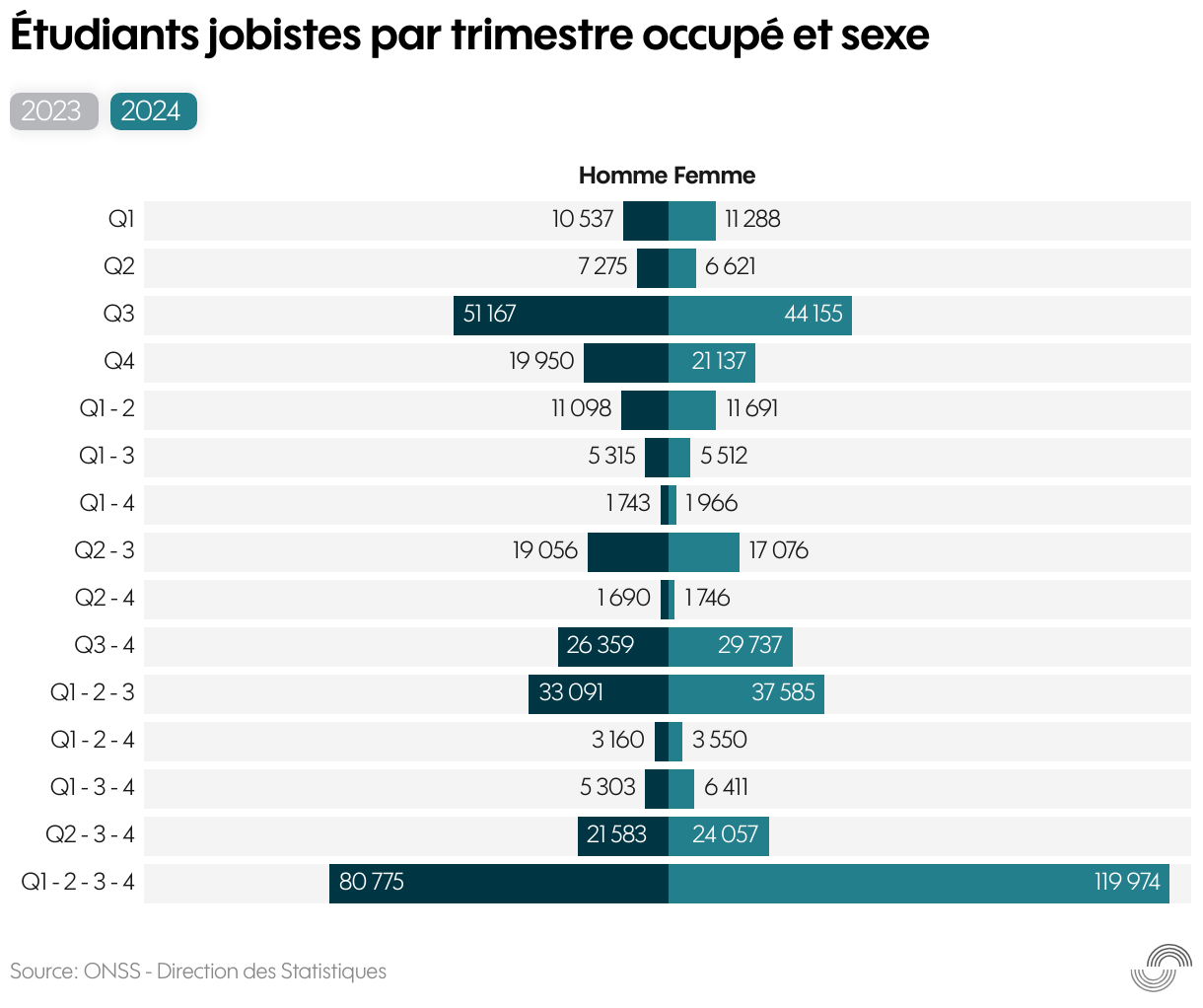 Étudiants jobistes par trimestre occupé et sexe
