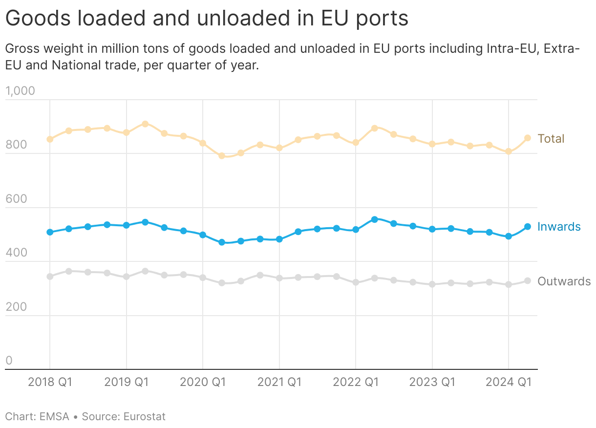 Gross weight in million tons of goods loaded and unloaded in EU ports including Intra-EU, Extra-EU and National trade, per quarter of year.