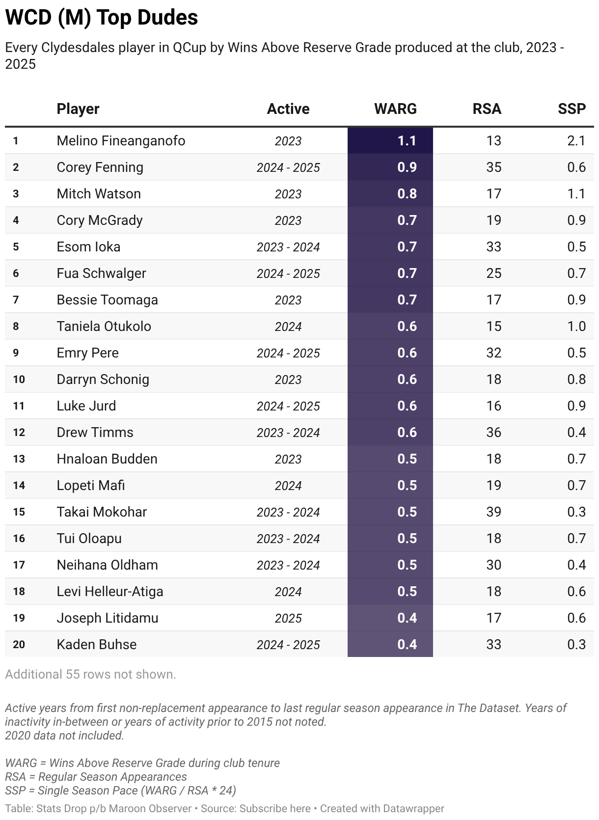 Every Clydesdales player in QCup by Wins Above Reserve Grade produced at the club, 2023 - 2025