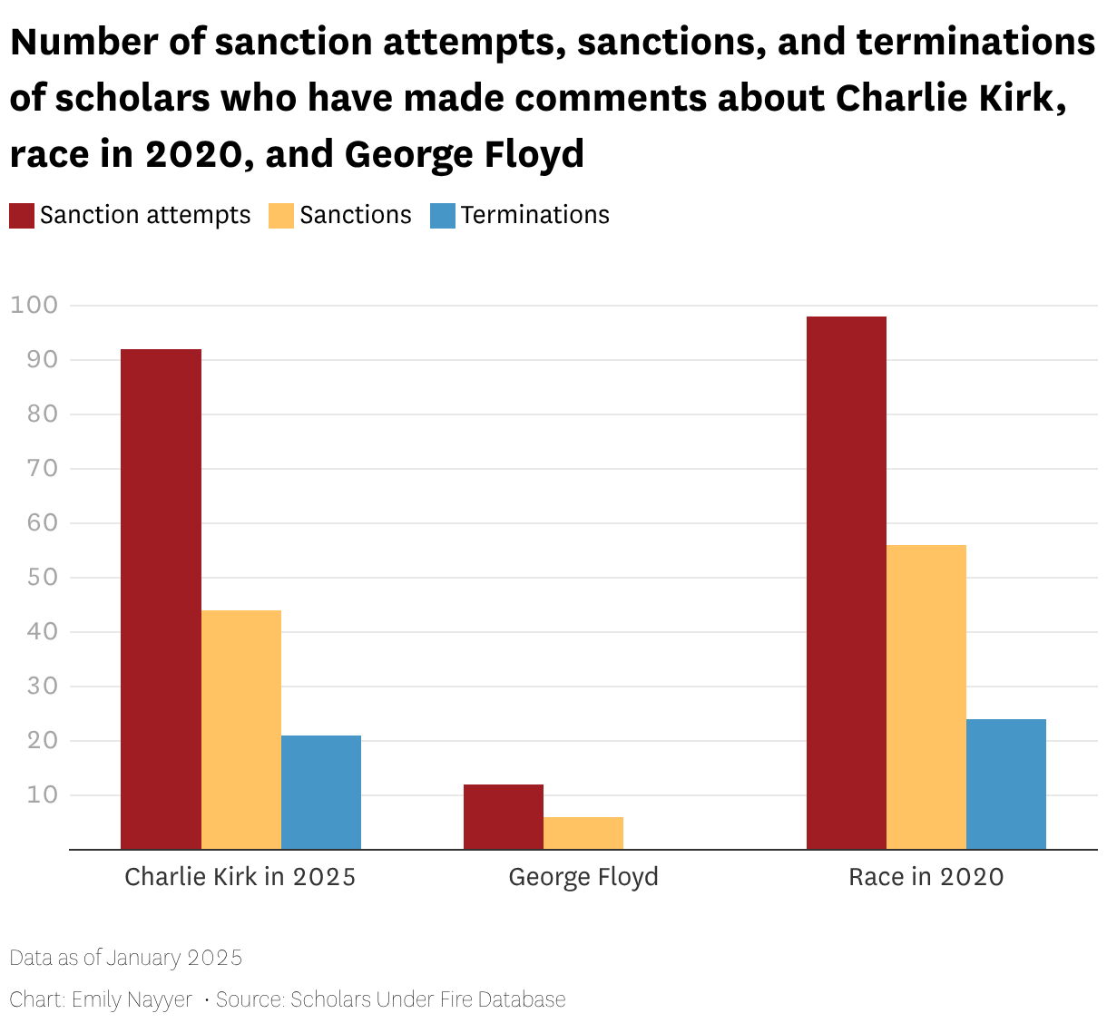 Number of sanction attempts, sanctions, and terminations of scholars who have made comments about Charlie Kirk, race in 2020, and George Floyd