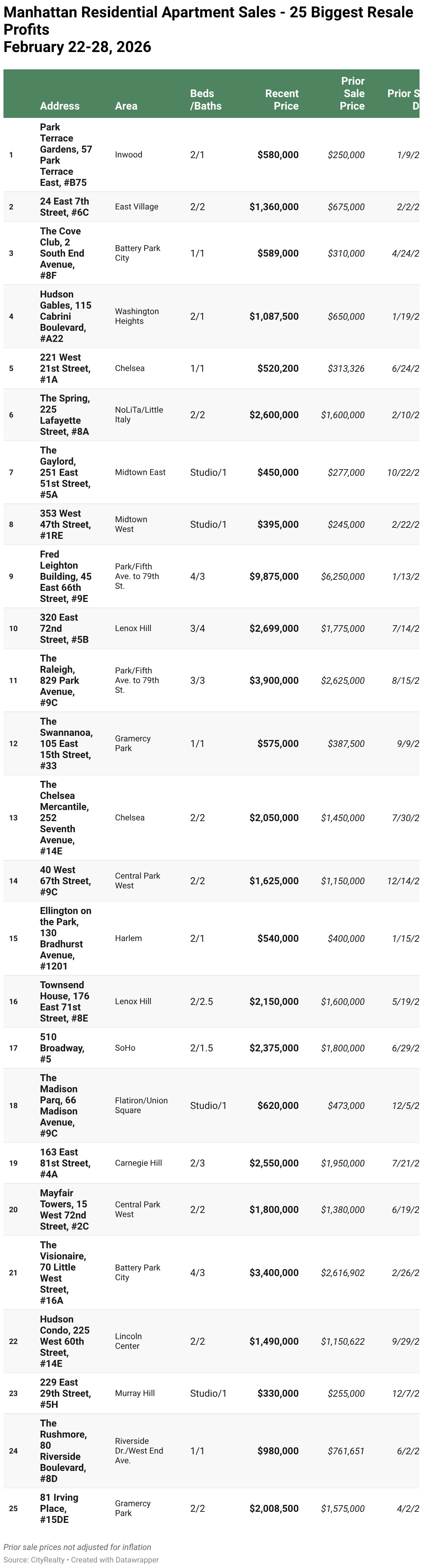 Manhattan Residential Apartment Sales - 25 Biggest Resale Profits