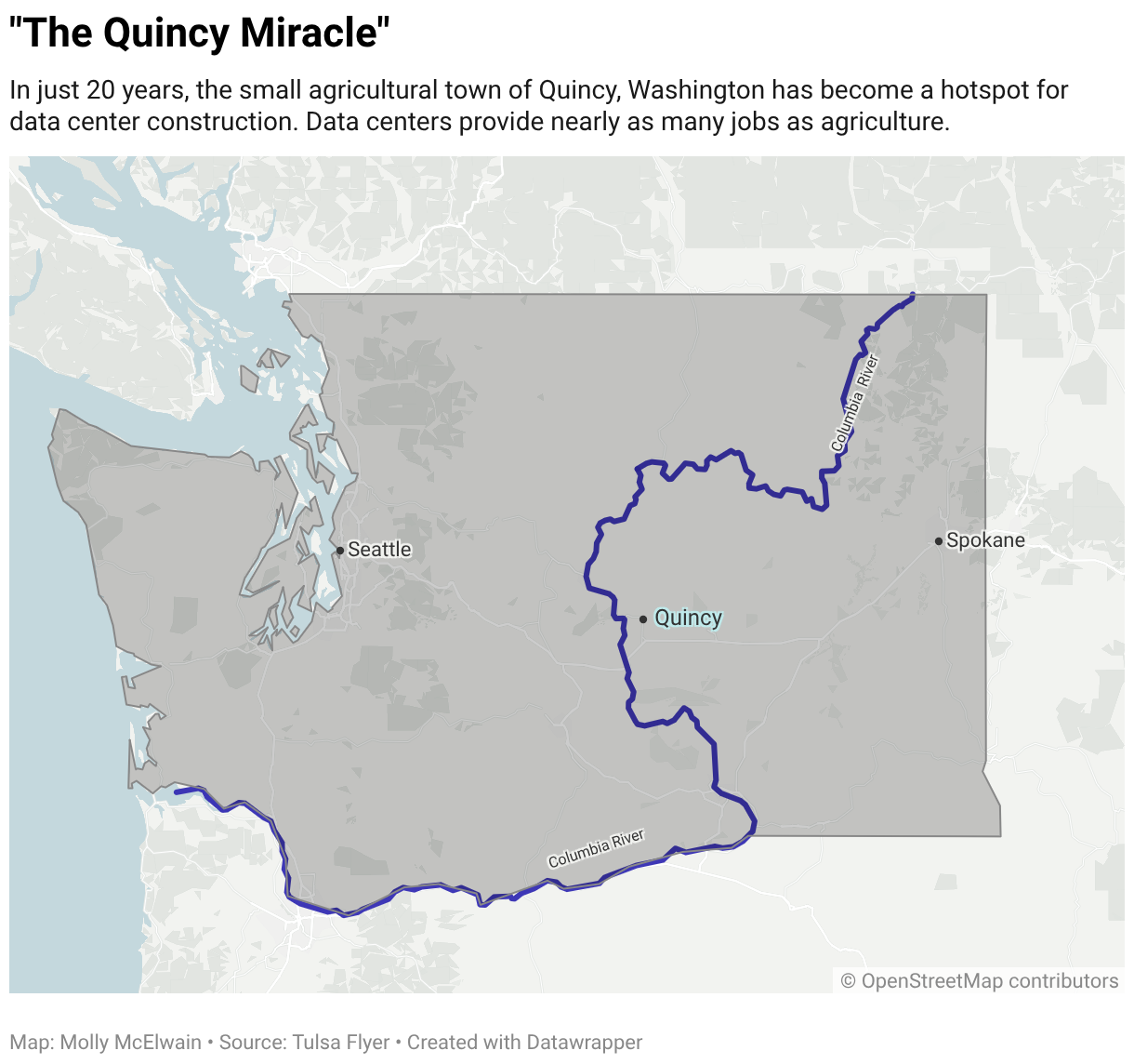 In just 20 years, the small agricultural town of Quincy, Washington has become a hotspot for data center construction. Data centers provide nearly as many jobs as agriculture.