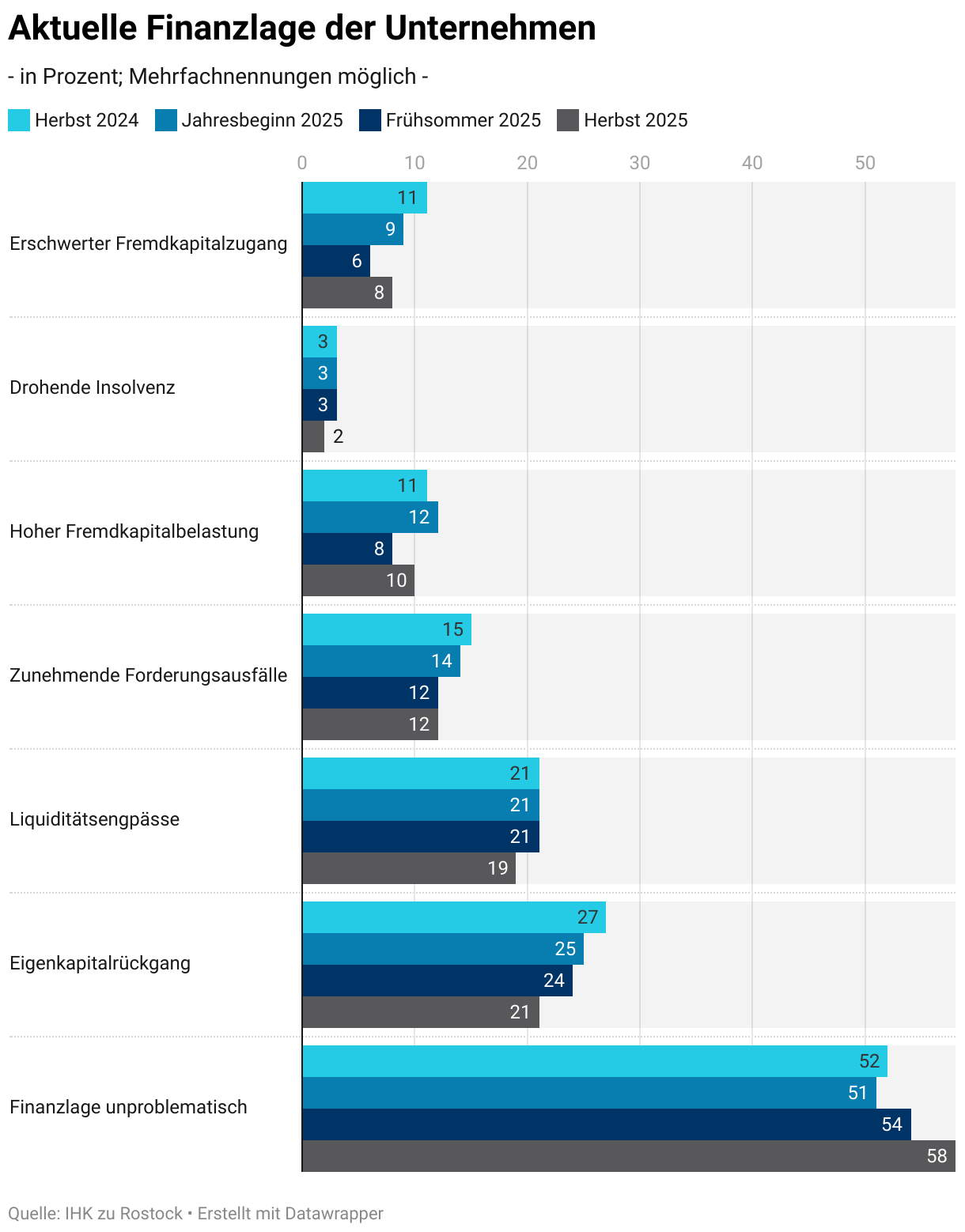 Das Balkendiagramm zeigt aktuelle Finanzlage der Unternehmen von Herbst 2024 bis Herbst 2025. Der Anteil unproblematischer Finanzlagen steigt von 52 % auf 58 %. Eigenkapitalrückgänge und Liquiditätsengpässe nehmen leicht ab. Forderungsausfälle und Fremdkapitalbelastung gehen zurück. Drohende Insolvenzen bleiben selten. Der Zugang zu Fremdkapital verbessert sich insgesamt.