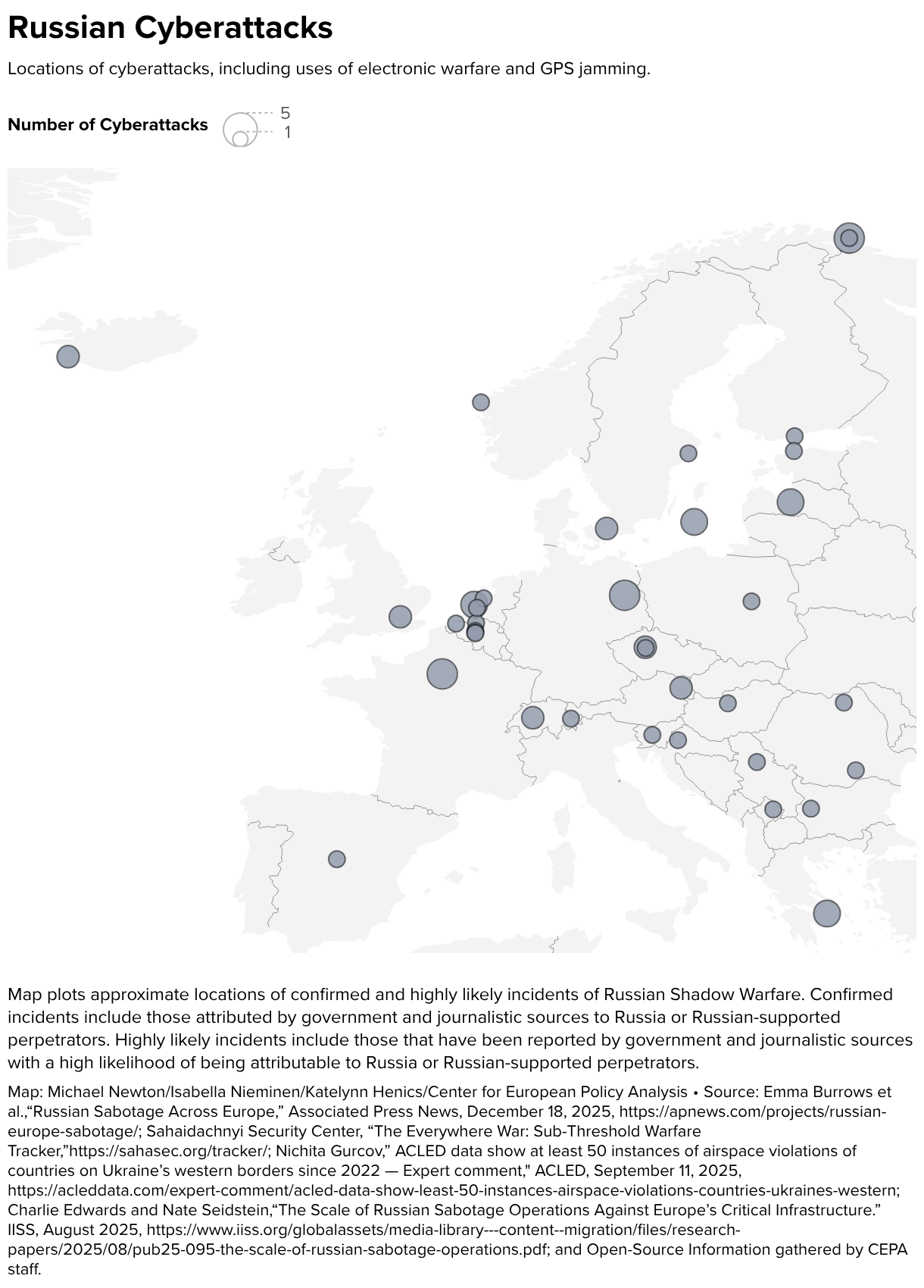 Locations of cyberattacks, including uses of electronic warfare and GPS jamming.
