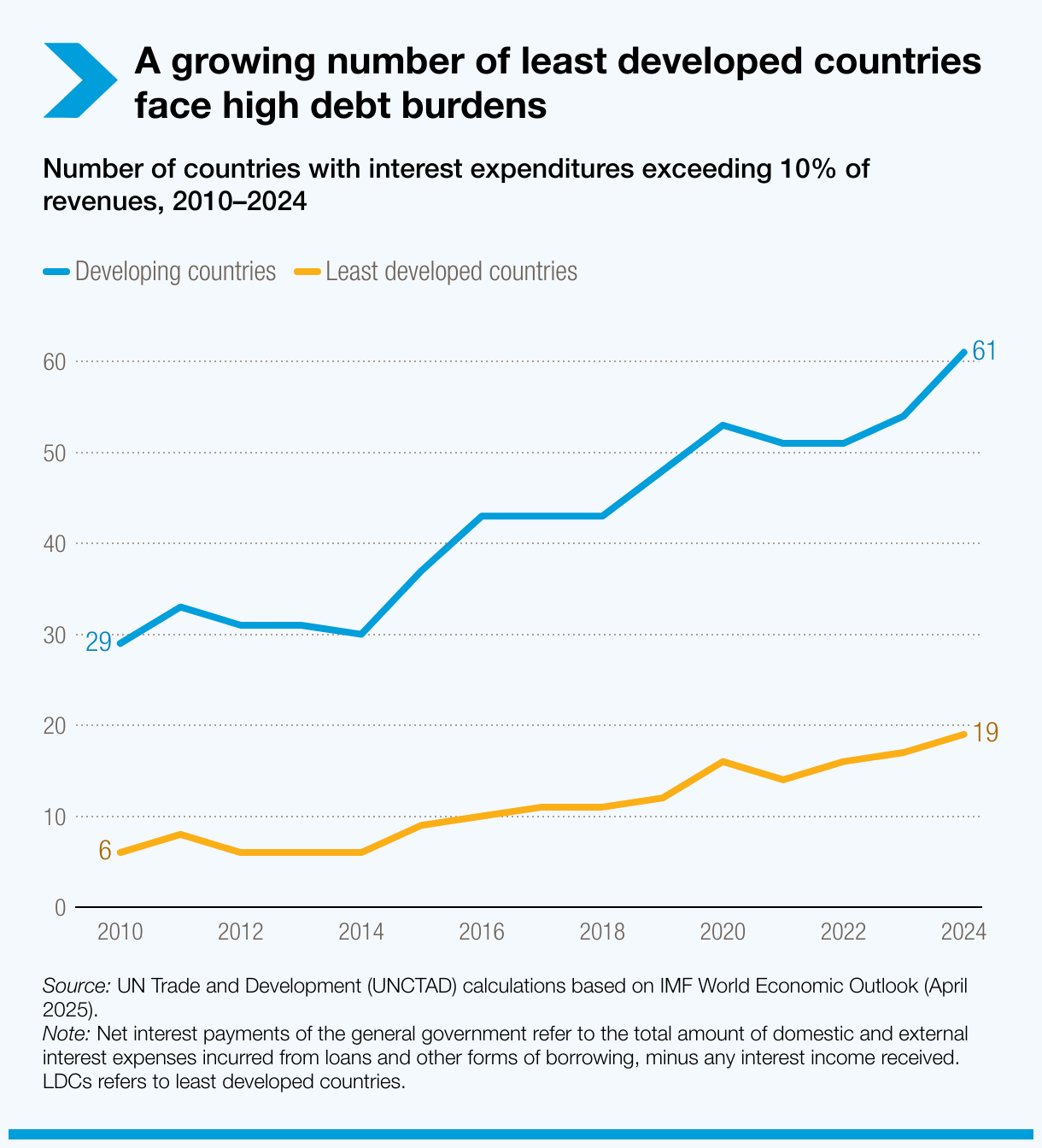 Number of countries with interest expenditures exceeding 10% of revenues, 2010–2024