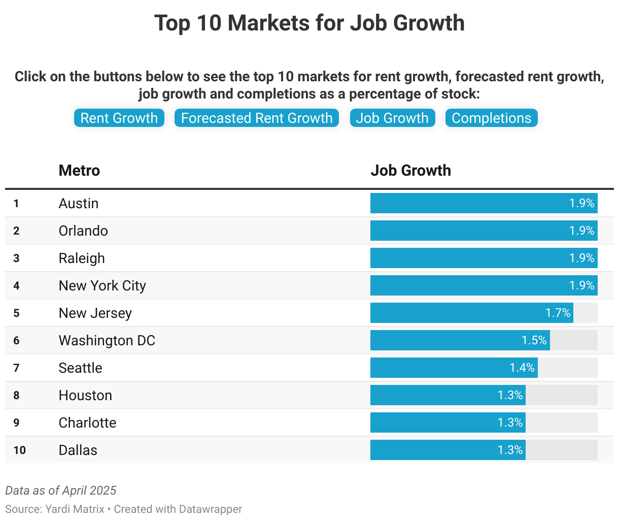 Click on the buttons below to see the top 10 markets for rent growth, forecasted rent growth, job growth and completions as a percentage of stock: