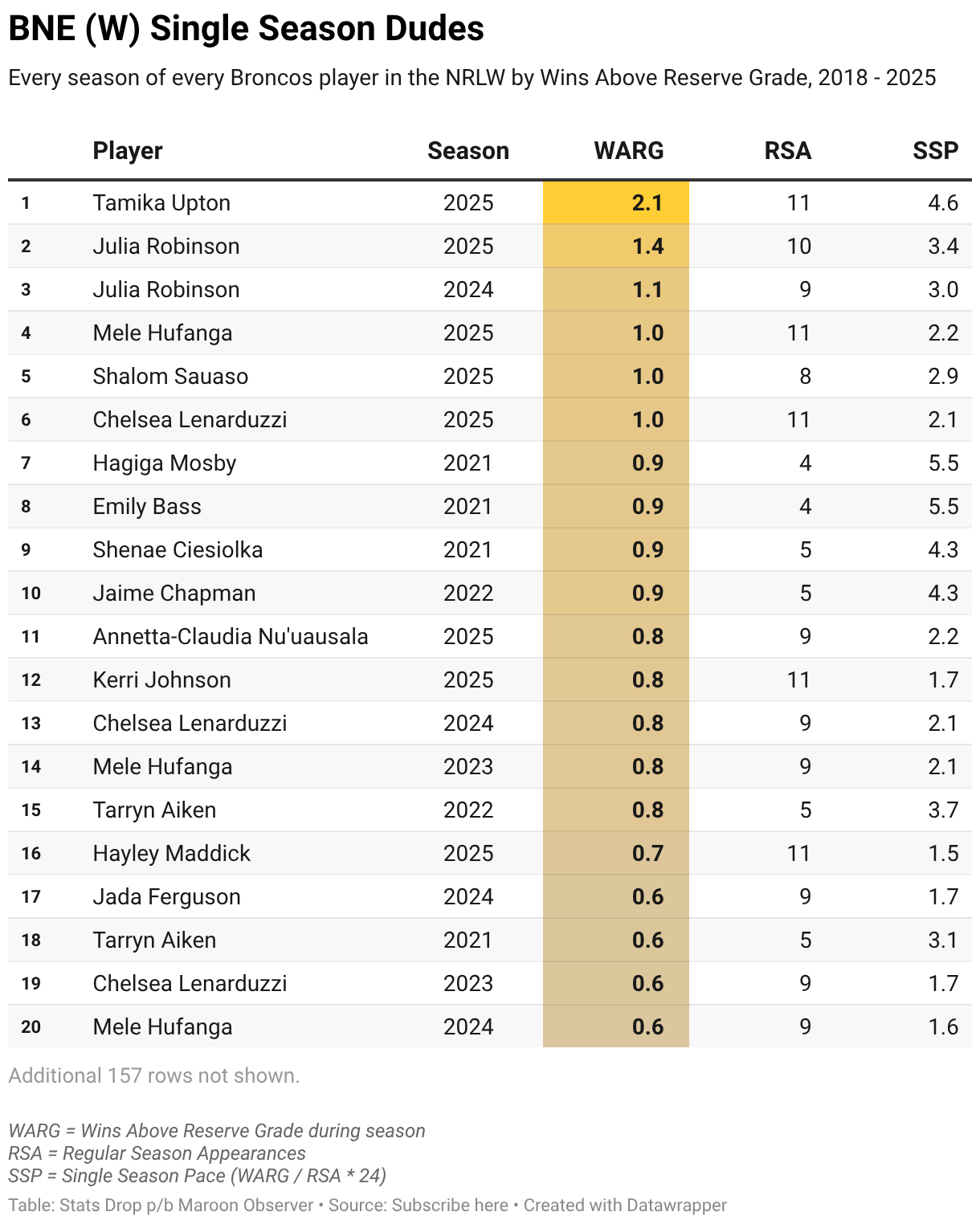 Every season of every Broncos player in the NRLW by Wins Above Reserve Grade, 2018 - 2025
