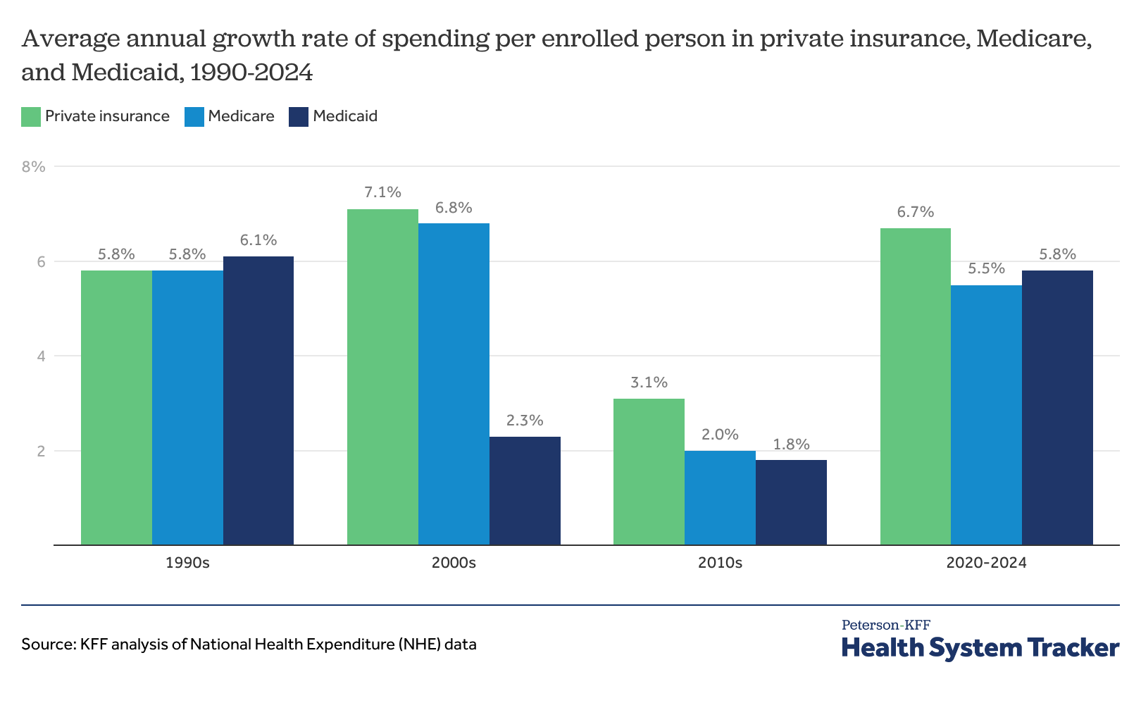 Average annual growth rate of spending per enrolled person in private insurance, Medicare, and Medicaid, 1990-2024