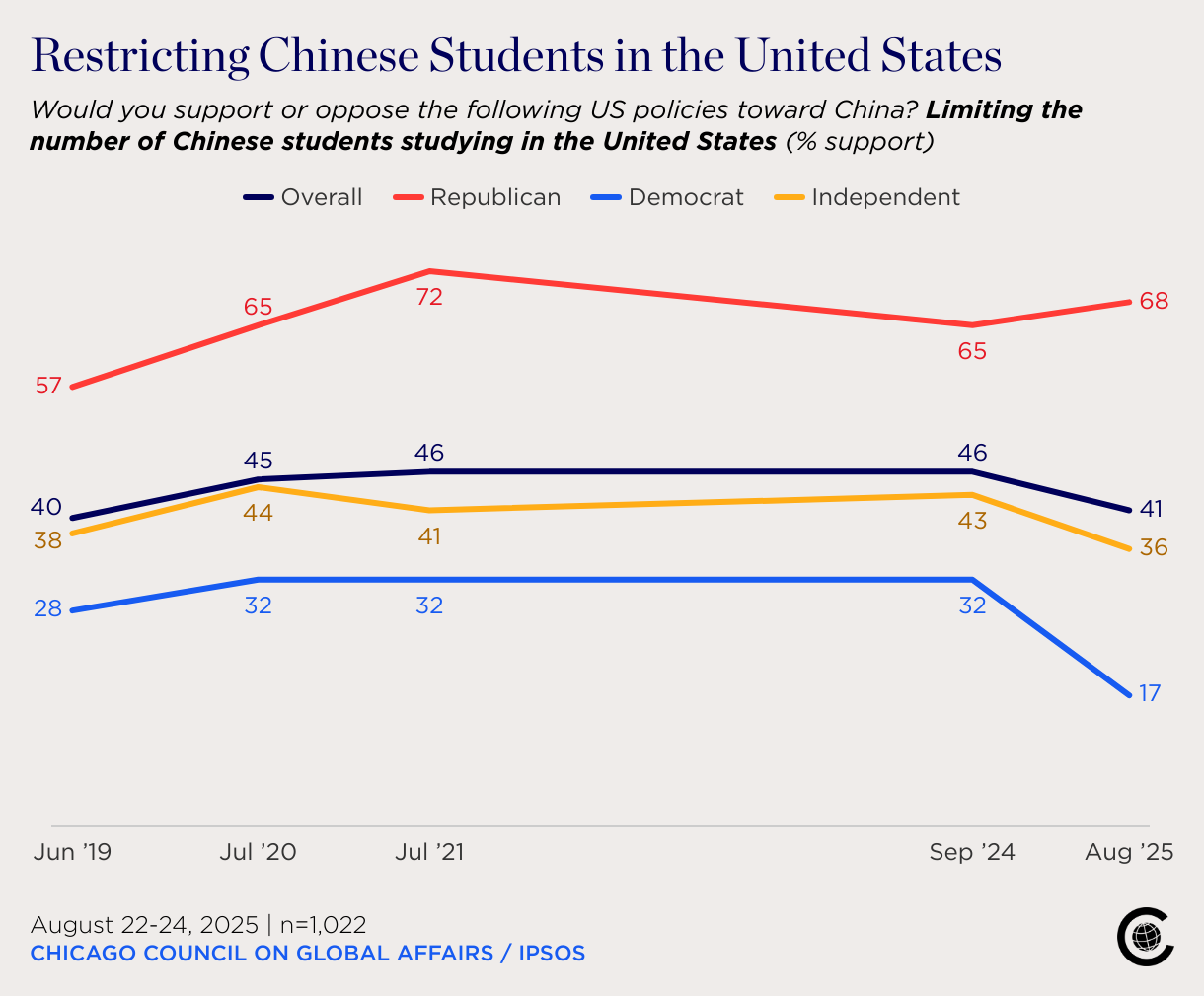 Would you support or oppose the following US policies toward China? Limiting the number of Chinese students studying in the United States (% support)
