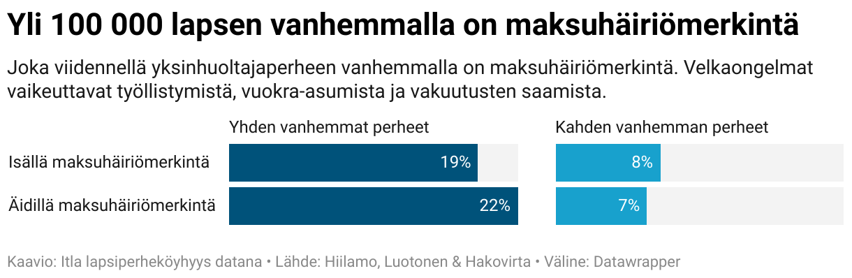 Joka viidennellä yksinhuoltajaperheen vanhemmalla on maksuhäiriömerkintä. Velkaongelmat vaikeuttavat työllistymistä, vuokra-asumista ja vakuutusten saamista.
