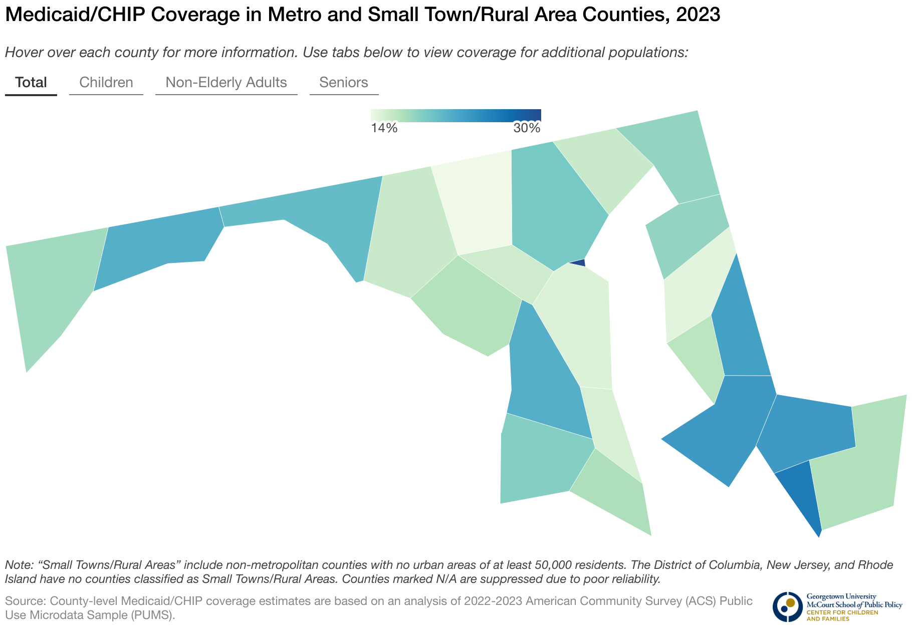 Hover over each county for more information. Use tabs below to view coverage for additional populations: Total Children Non-Elderly Adults Seniors