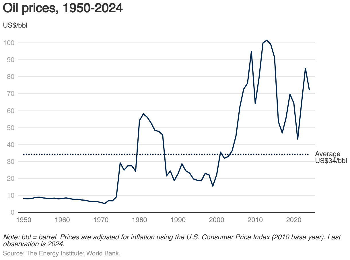 Oil prices, 1950-2024