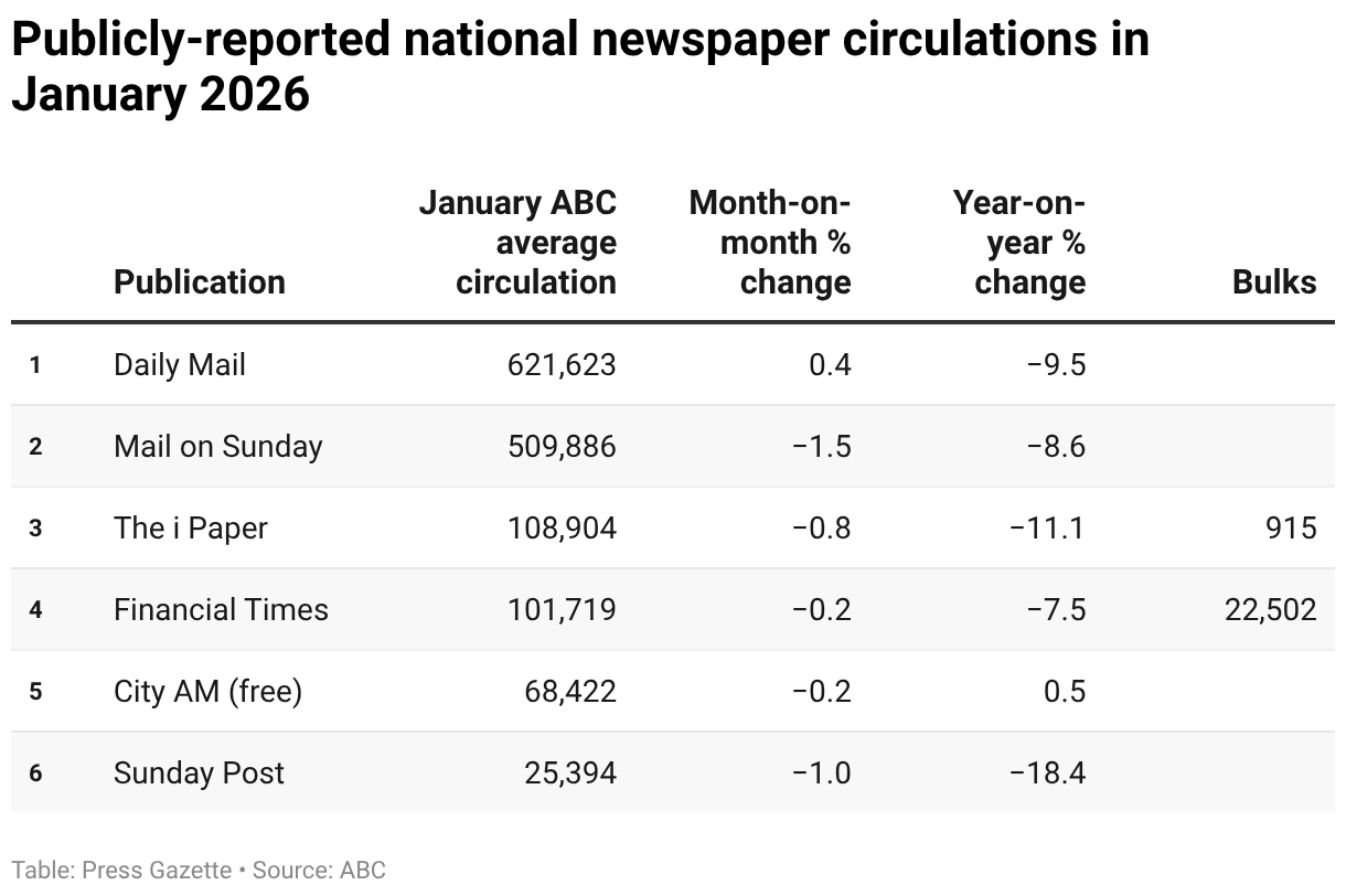 Publicly-reported national newspaper circulations in January 2026