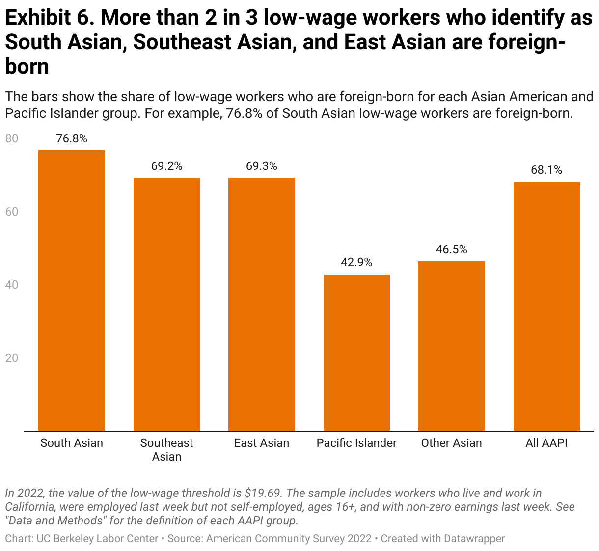 Exhibit 6. More than 2 in 3 low-wage workers who identify as South Asian, Southeast Asian, and East Asian are foreign-born