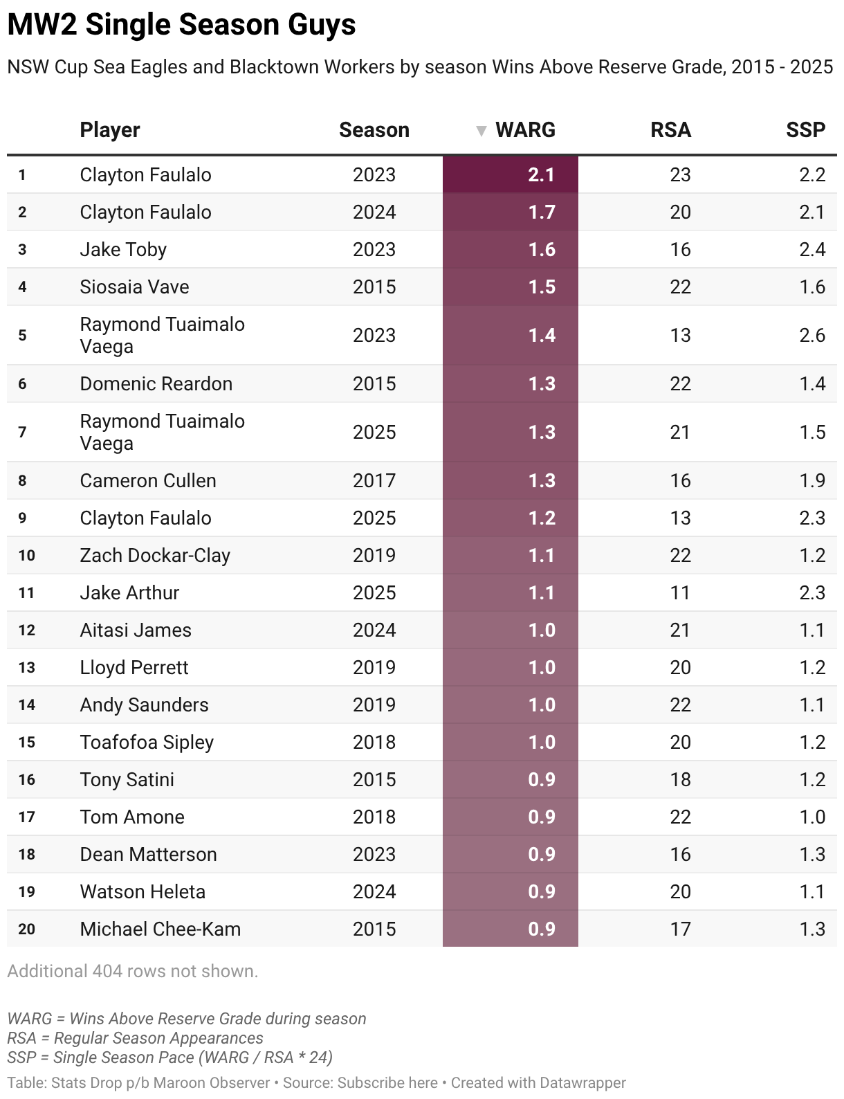 NSW Cup Sea Eagles and Blacktown Workers by season Wins Above Reserve Grade, 2015 - 2025
