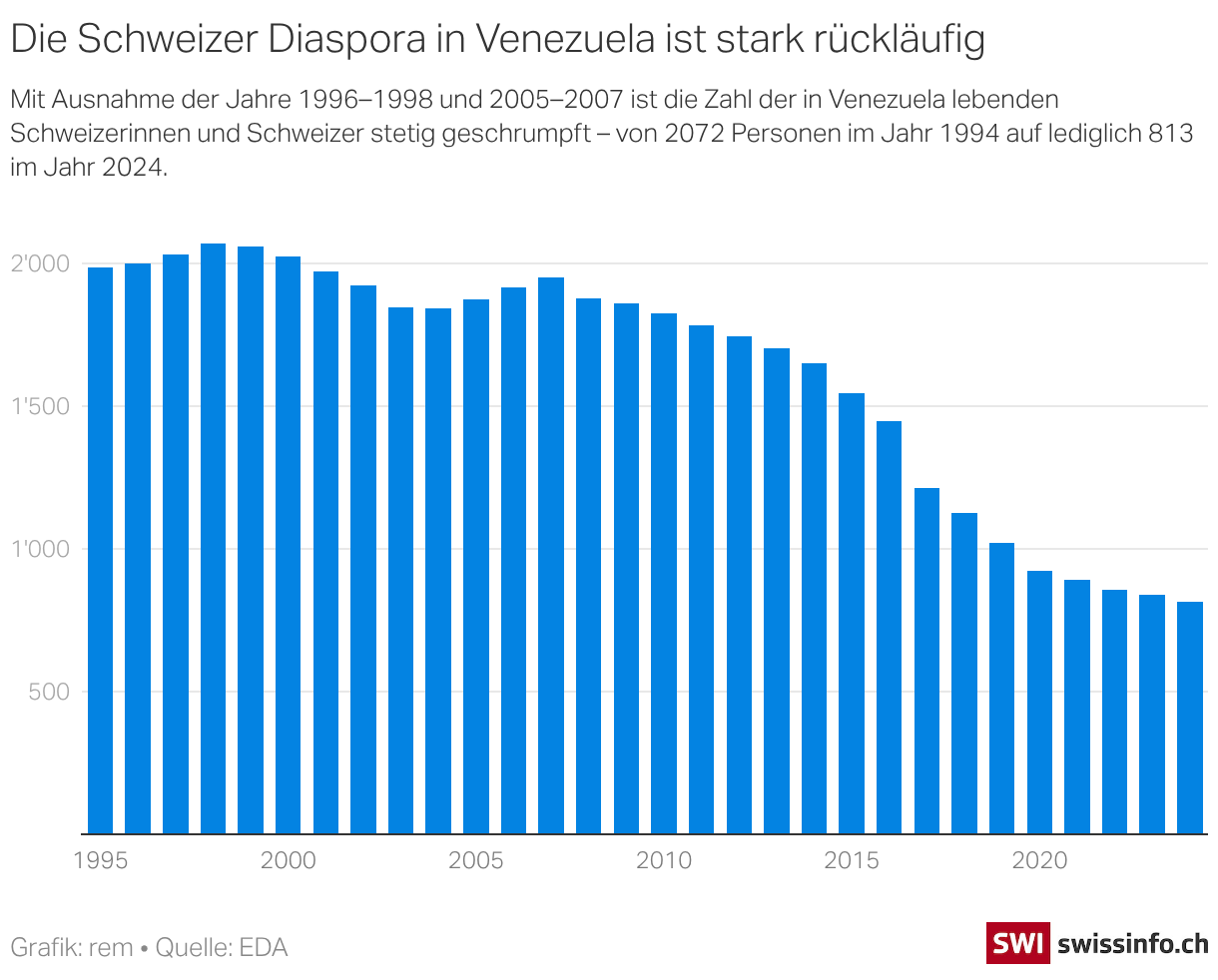 Mit Ausnahme der Jahre 1996–1998 und 2005–2007 ist die Zahl der in Venezuela lebenden Schweizerinnen und Schweizer stetig geschrumpft – von 2072 Personen im Jahr 1994 auf lediglich 813 im Jahr 2024.