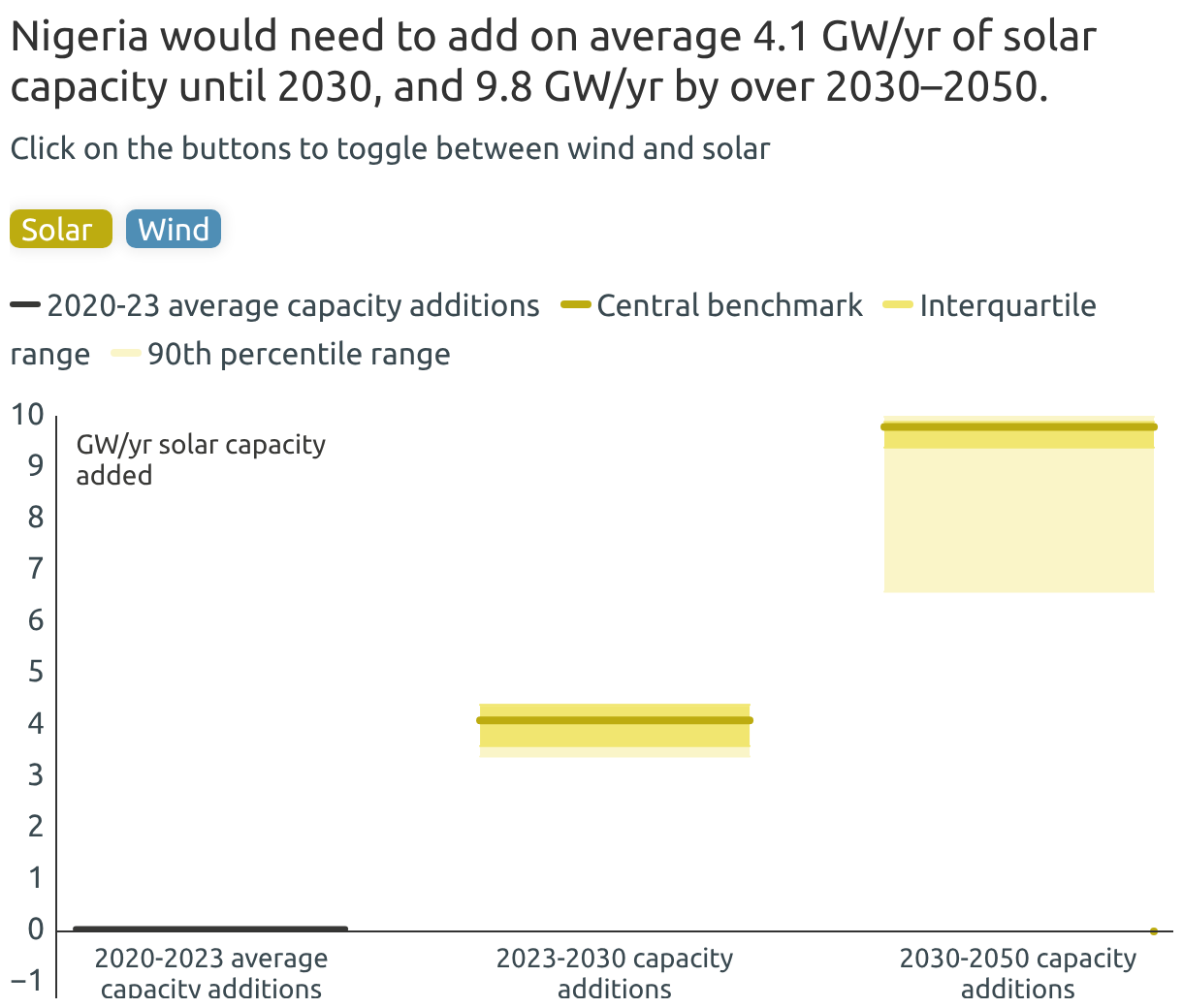 Nigeria would need to add on average 4.1 GW/yr of solar capacity until 2030, and 9.8 GW/yr by over 2030–2050.