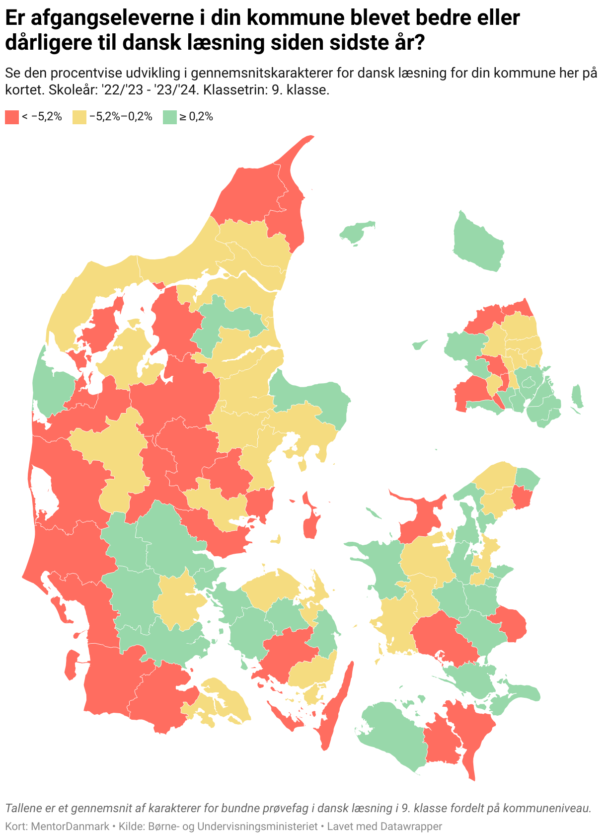 Se den procentvise udvikling i gennemsnitskarakterer for dansk læsning for din kommune her på kortet. Skoleår: '22/'23 - '23/'24. Klassetrin: 9. klasse.