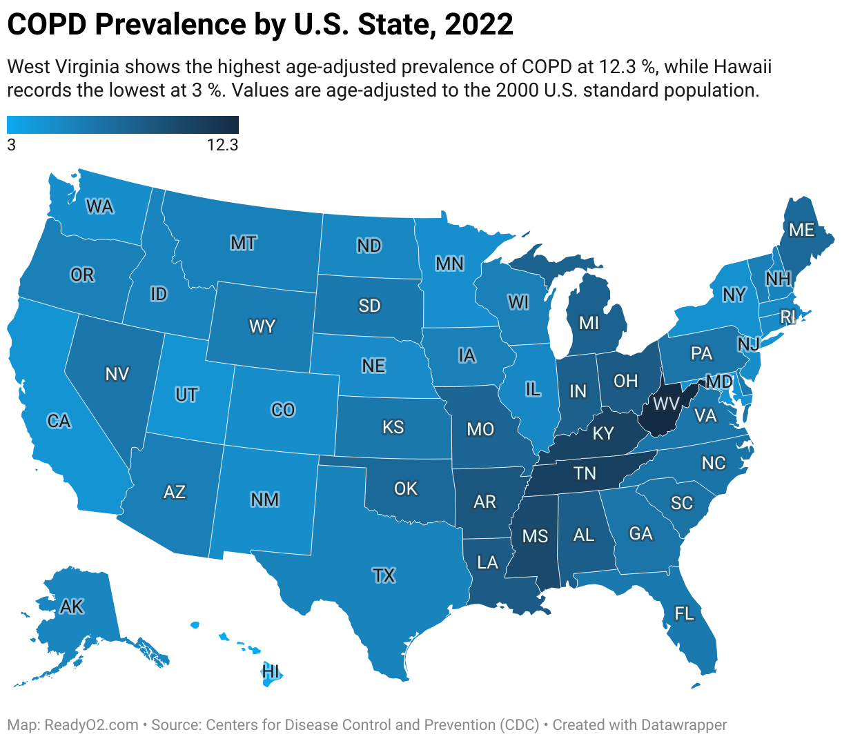 West Virginia shows the highest age-adjusted prevalence of COPD at 12.3 %, while Hawaii records the lowest at 3 %. Values are age-adjusted to the 2000 U.S. standard population.