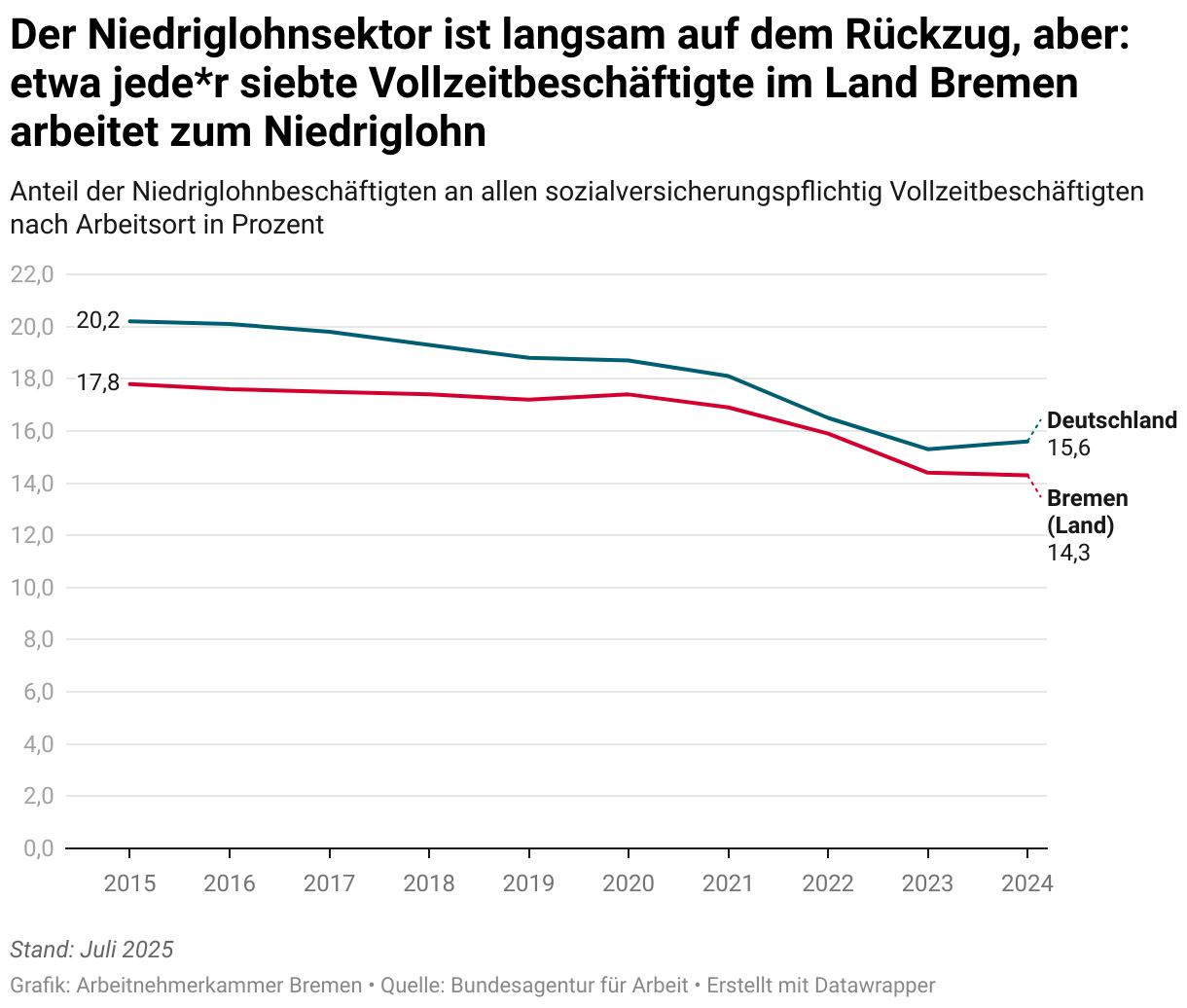 Anteil der Niedriglohnbeschäftigten an allen sozialversicherungspflichtig Vollzeitbeschäftigten nach Arbeitsort in Prozent