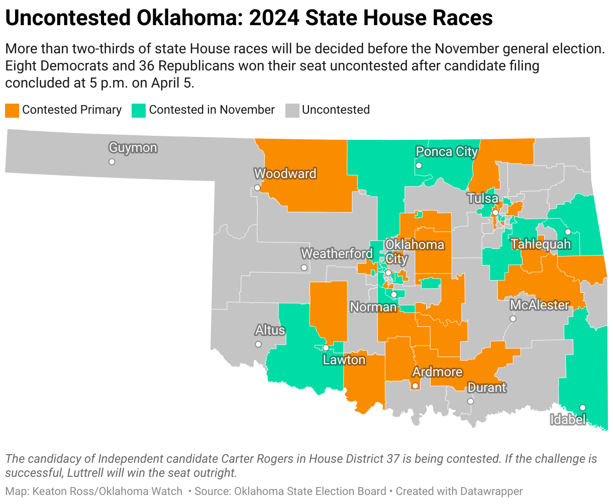 More than two-thirds of state House races will be decided before the November general election. Eight Democrats and 36 Republicans won their seat uncontested after candidate filing concluded at 5 p.m. on April 5.