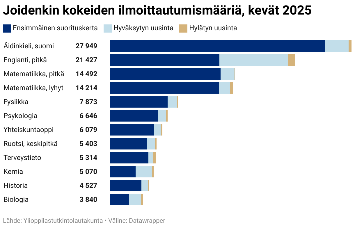 Joidenkin kokeiden ilmoittautumismääriä, kevät 2025