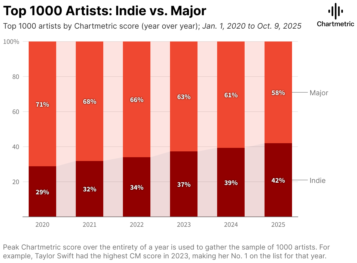 Top 1000 artists by Chartmetric score (year over year); Jan. 1, 2020 to Oct. 9, 2025