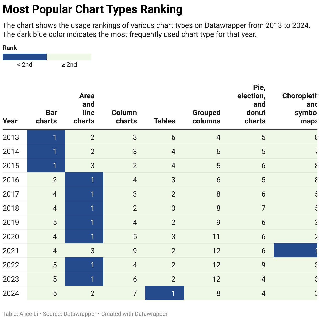 The chart shows the usage rankings of various chart types on Datawrapper from 2013 to 2024. The dark blue color indicates the most frequently used chart type for that year.