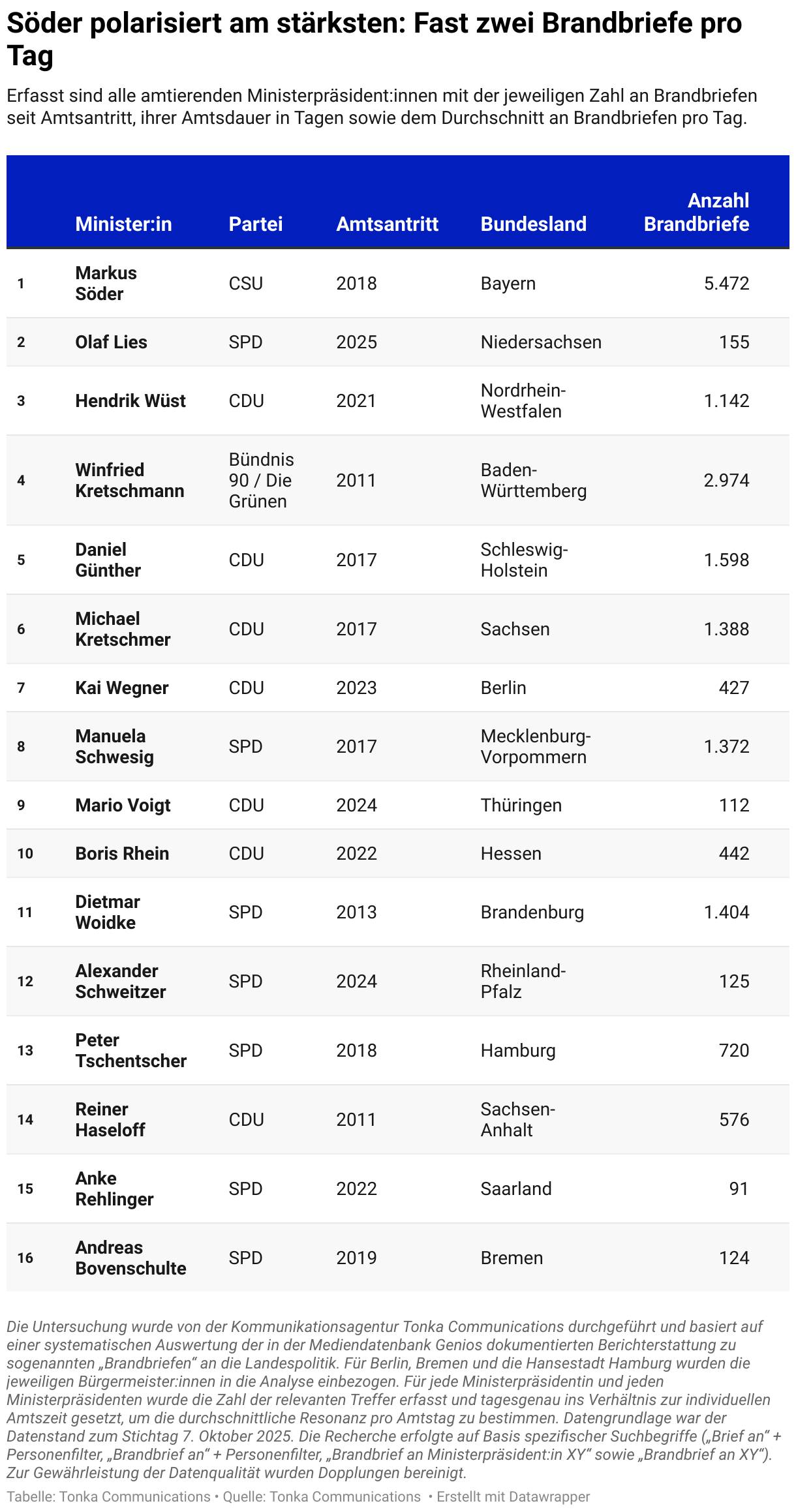 Erfasst sind alle amtierenden Ministerpräsident:innen mit der jeweiligen Zahl an Brandbriefen seit Amtsantritt, ihrer Amtsdauer in Tagen sowie dem Durchschnitt an Brandbriefen pro Tag.