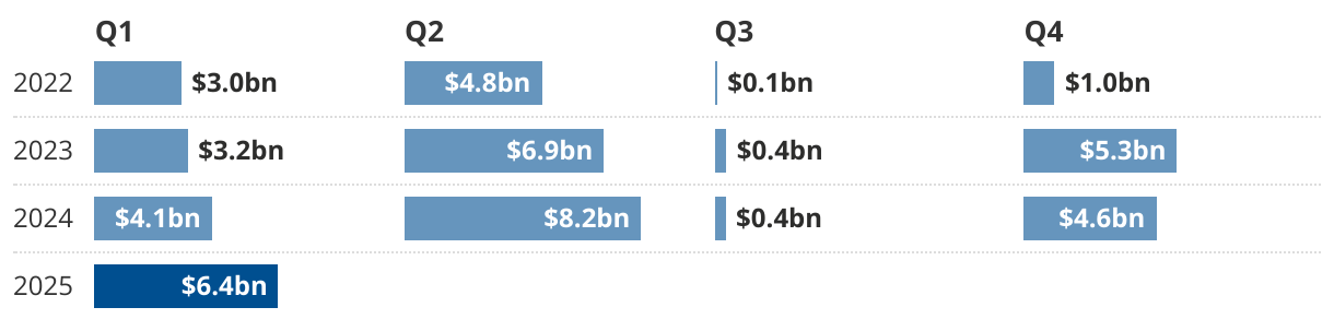 Volume (in $bn) of cat bonds issued in each quarter since Q1 2020
