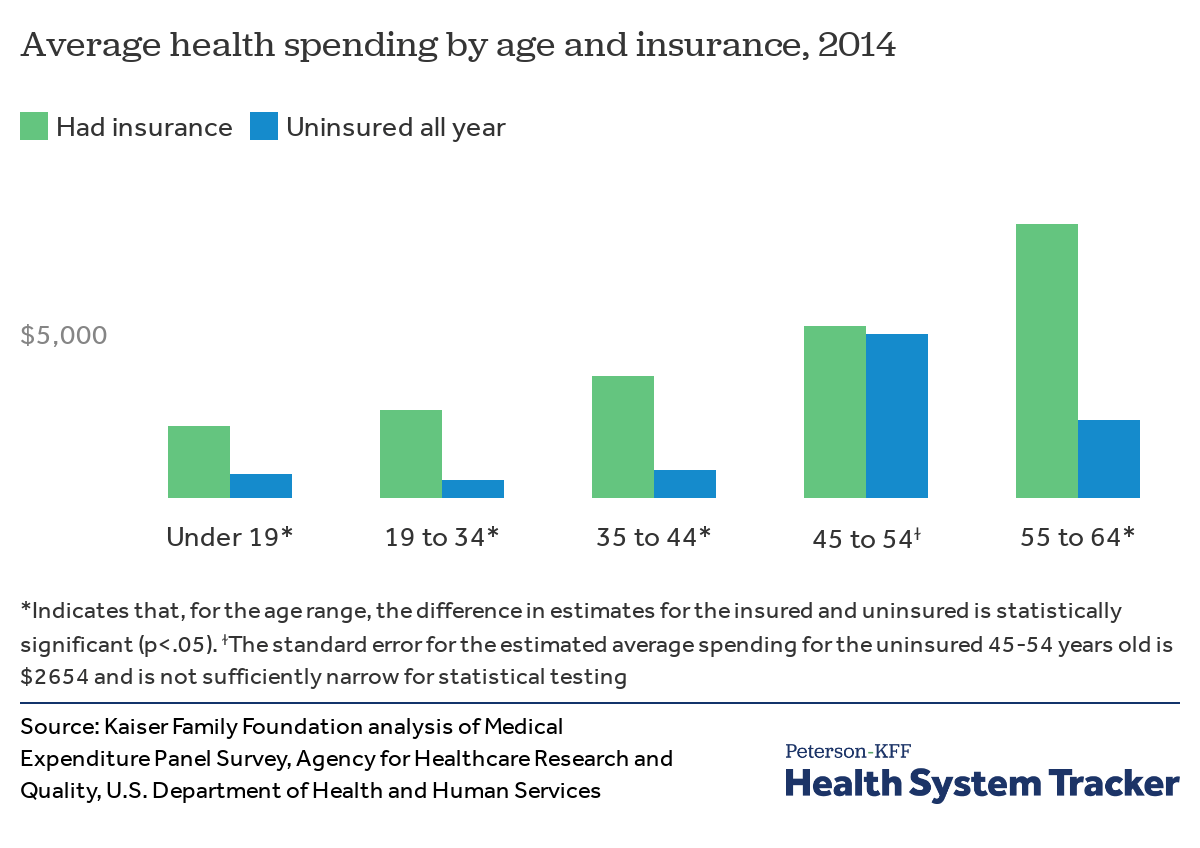 *Indicates that, for the age range, the difference in estimates for the insured and uninsured is statistically significant (p<.05). ꭞThe standard error for the estimated average spending for the uninsured 45-54 years old is $2654 and is not sufficiently narrow for statistical testing