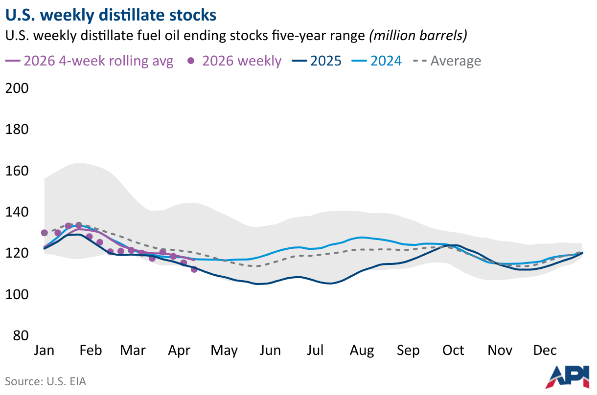 U.S. weekly distillate fuel oil ending stocks five-year range (million barrels)