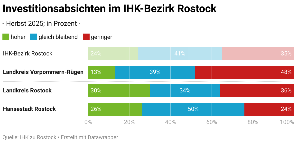 Das Balkendiagramm zeigt die Investitionsabsichten im IHK-Bezirk Rostock für Herbst 2025. In Rostock sind die höheren Investitionen am stärksten vertreten. Vorpommern-Rügen meldet den höchsten Anteil geringerer Investitionen. Insgesamt überwiegen gleichbleibende Investitionen.