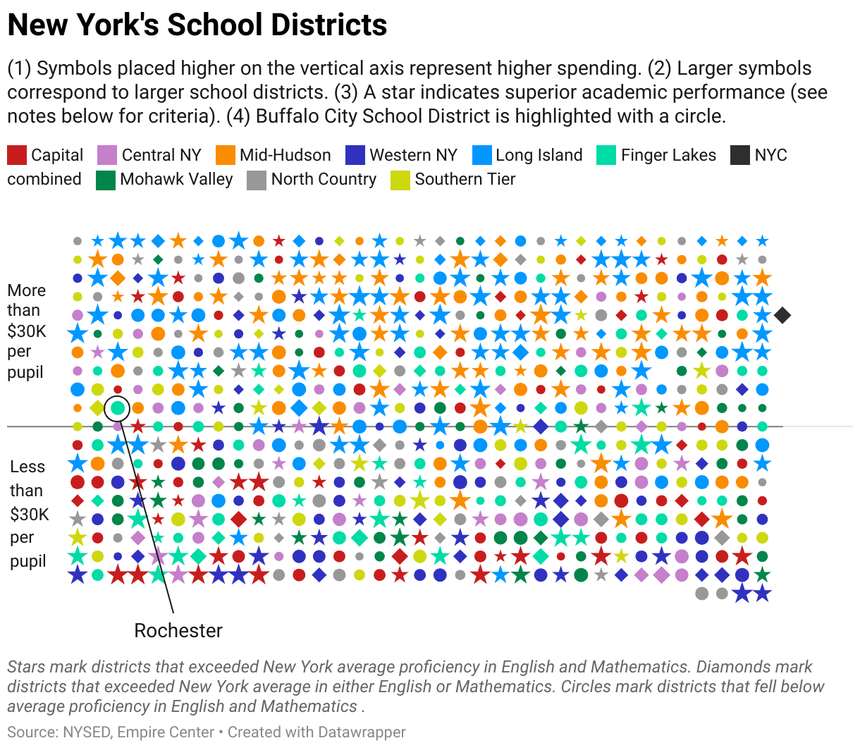(1) Symbols placed higher on the vertical axis represent higher spending. (2) Larger symbols correspond to larger school districts. (3) A star indicates superior academic performance (see notes below for criteria). (4) Buffalo City School District is highlighted with a circle.