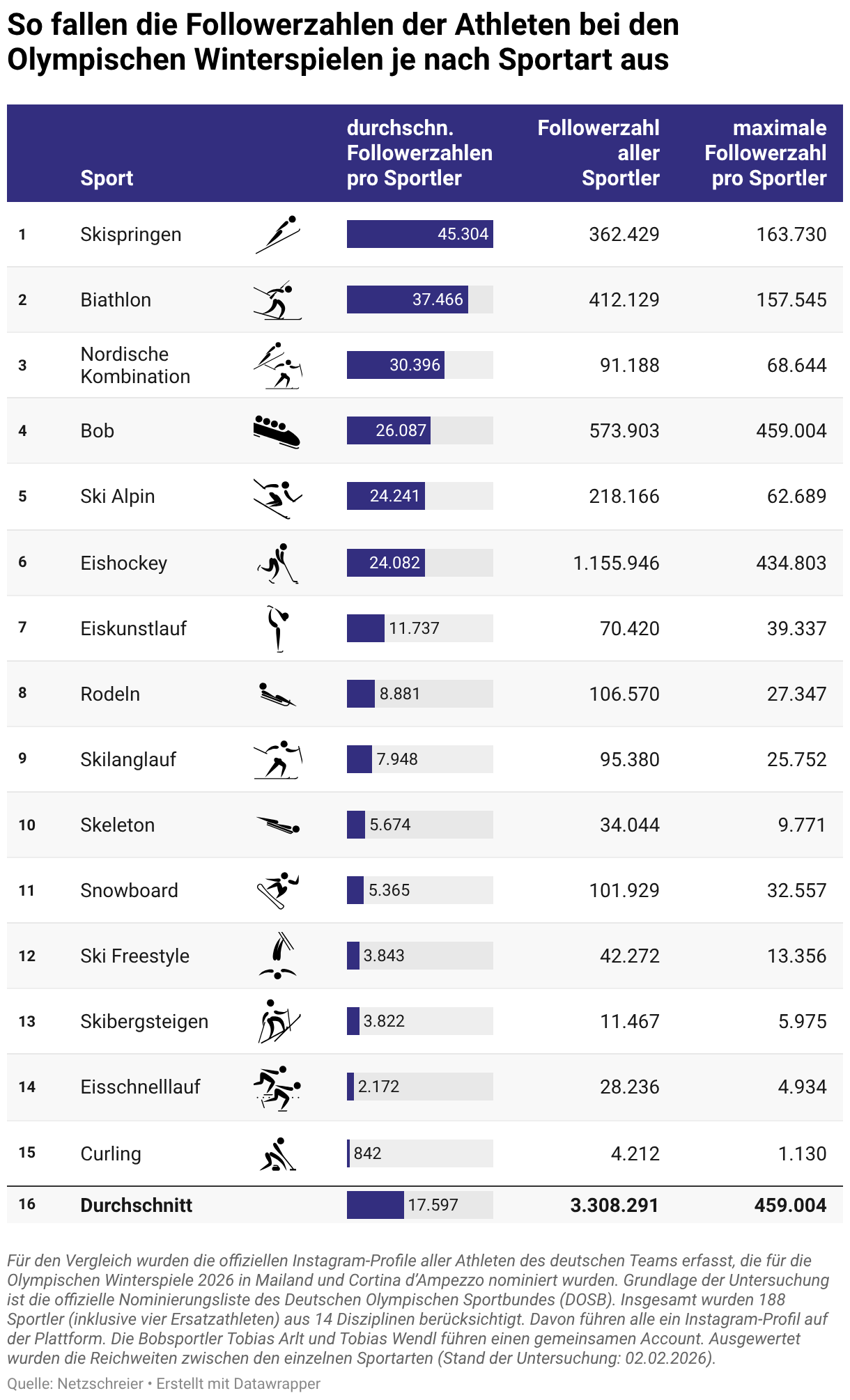 So fallen die Followerzahlen der Athleten bei den Olympischen Winterspielen je nach Sportart aus