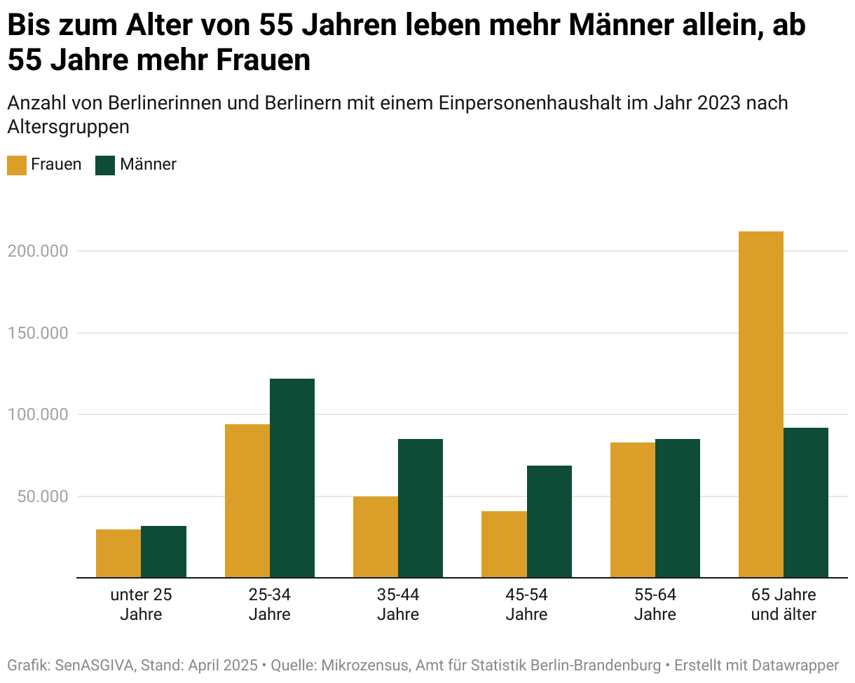 Bei beiden Geschlechtern leben in der Altersgruppe von 25 bis 34 Jahren die meisten Menschen allein (Männer etwa 120.000, Frauen etwa 94.000). Bis zu einem Alter von 54 Jahren leben jeweils mehr Männer allein.