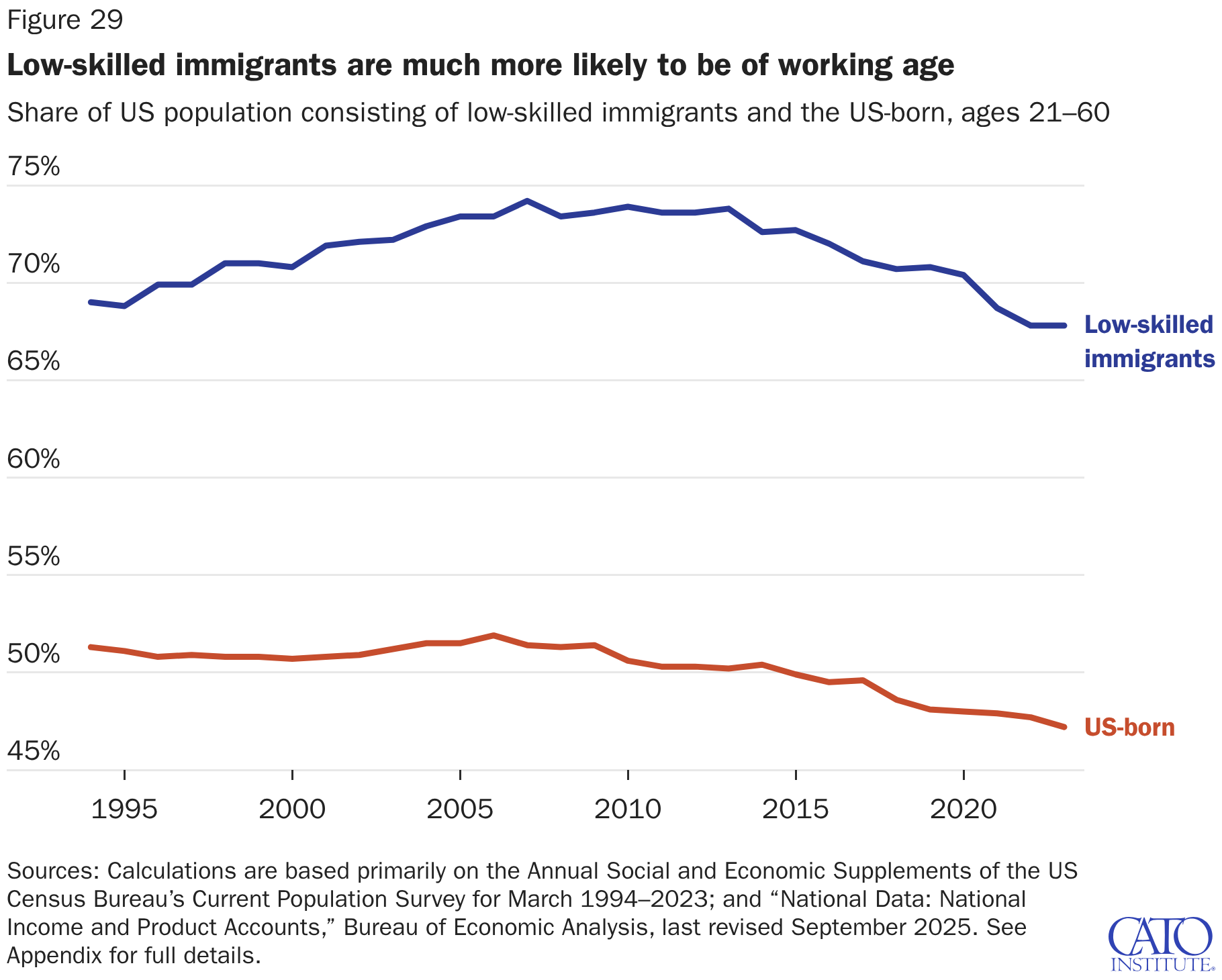Share of US population consisting of low-skilled immigrants and the US-born, ages 21–60