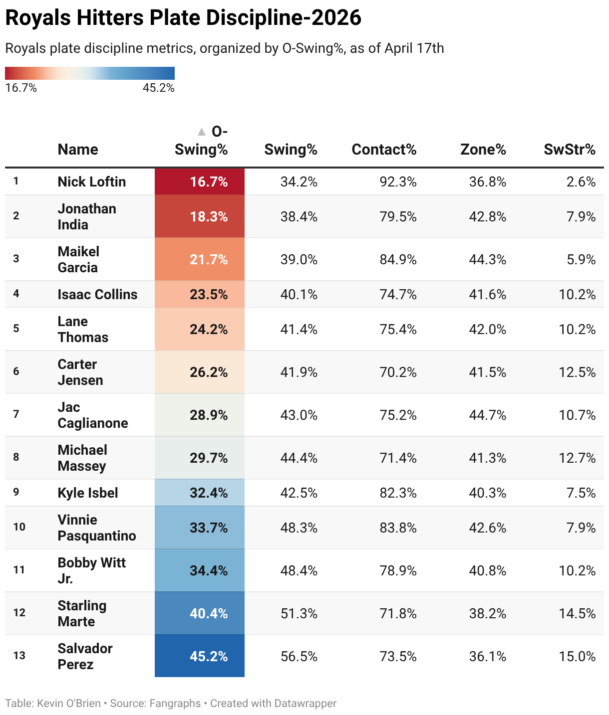 Royals plate discipline metrics, organized by O-Swing%, as of April 17th