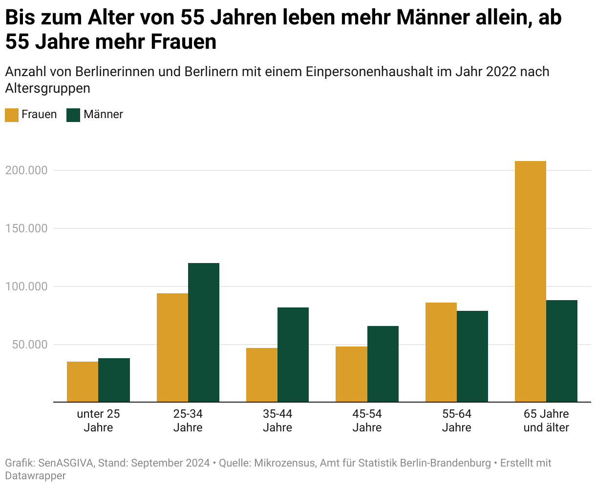Bei beiden Geschlechtern leben in der Altersgruppe von 25 bis 34 Jahren die meisten Menschen allein (Männer etwa 120.000, Frauen etwa 94.000). Bis zu einem Alter von 54 Jahren leben jeweils mehr Männer allein.