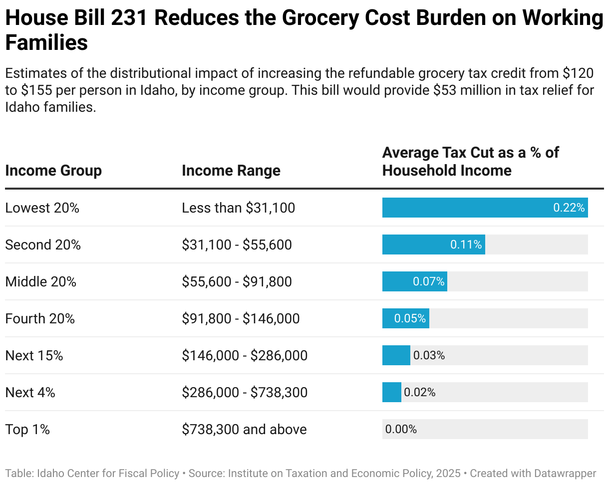 Estimates of the distributional impact of increasing the refundable grocery tax credit from $120 to $155 per person in Idaho, by income group. This bill would provide $53 million in tax relief for Idaho families.