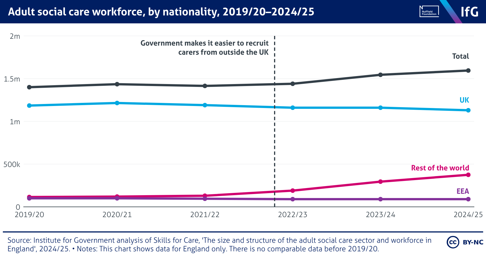 Adult social care workforce, by nationality, 2019/20–2024/25