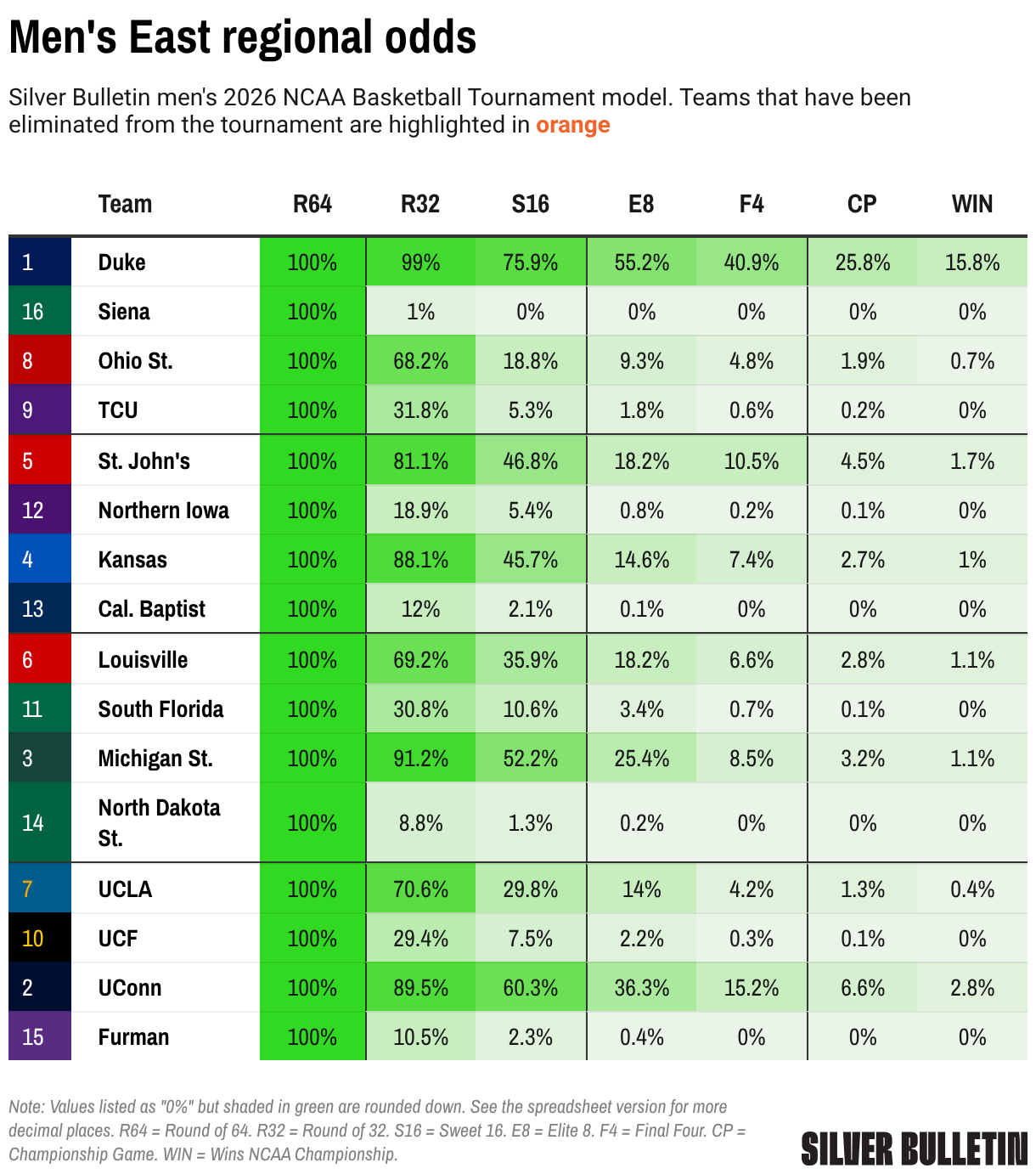 Silver Bulletin men's 2026 NCAA Basketball Tournament model. Teams that have been eliminated from the tournament are highlighted in orange