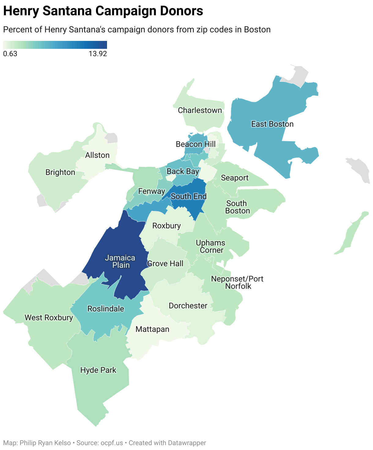 Percent of Henry Santana's campaign donors from zip codes in Boston