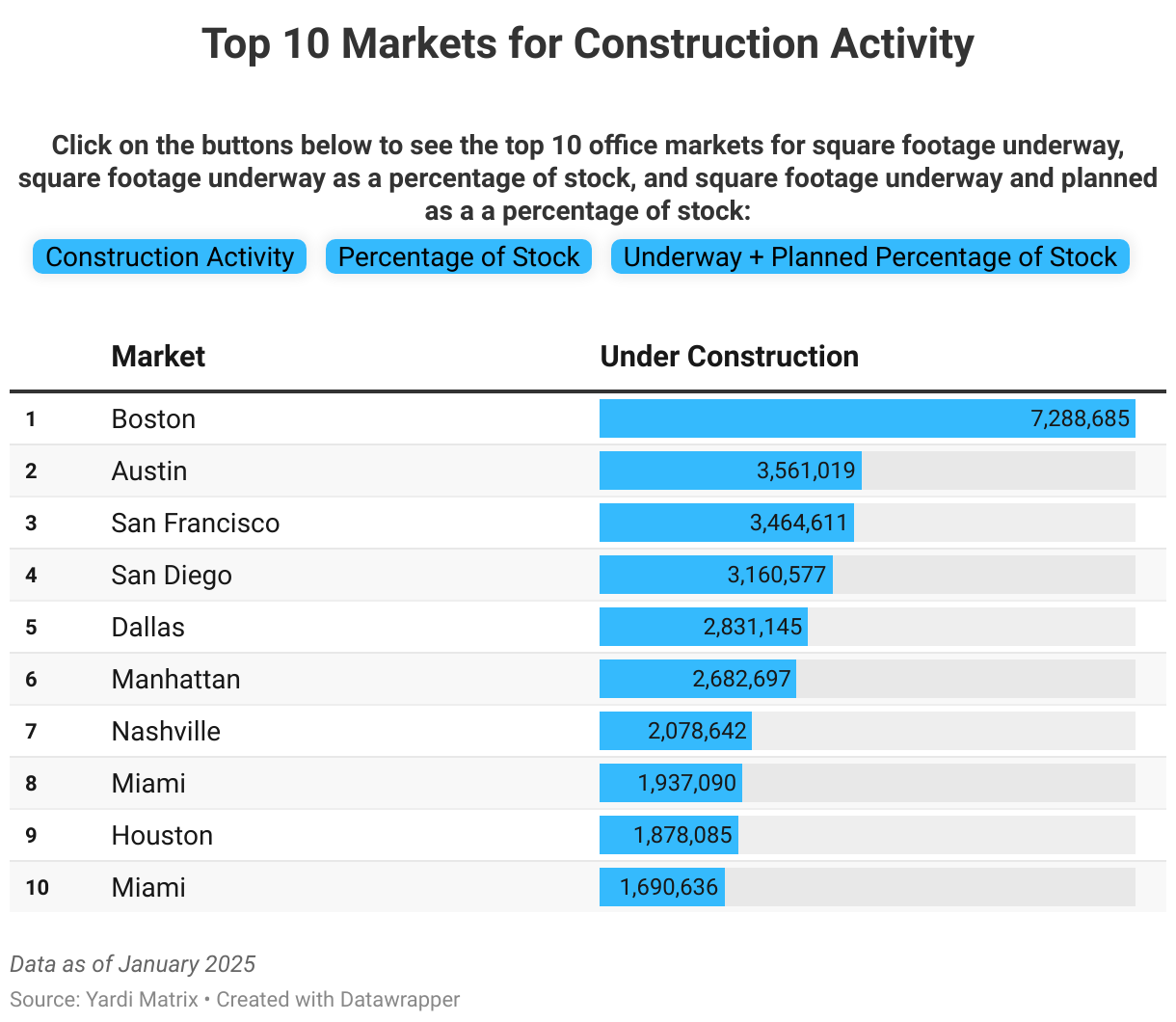 Click on the buttons below to see the top 10 office markets for square footage underway, square footage underway as a percentage of stock, and square footage underway and planned as a a percentage of stock: