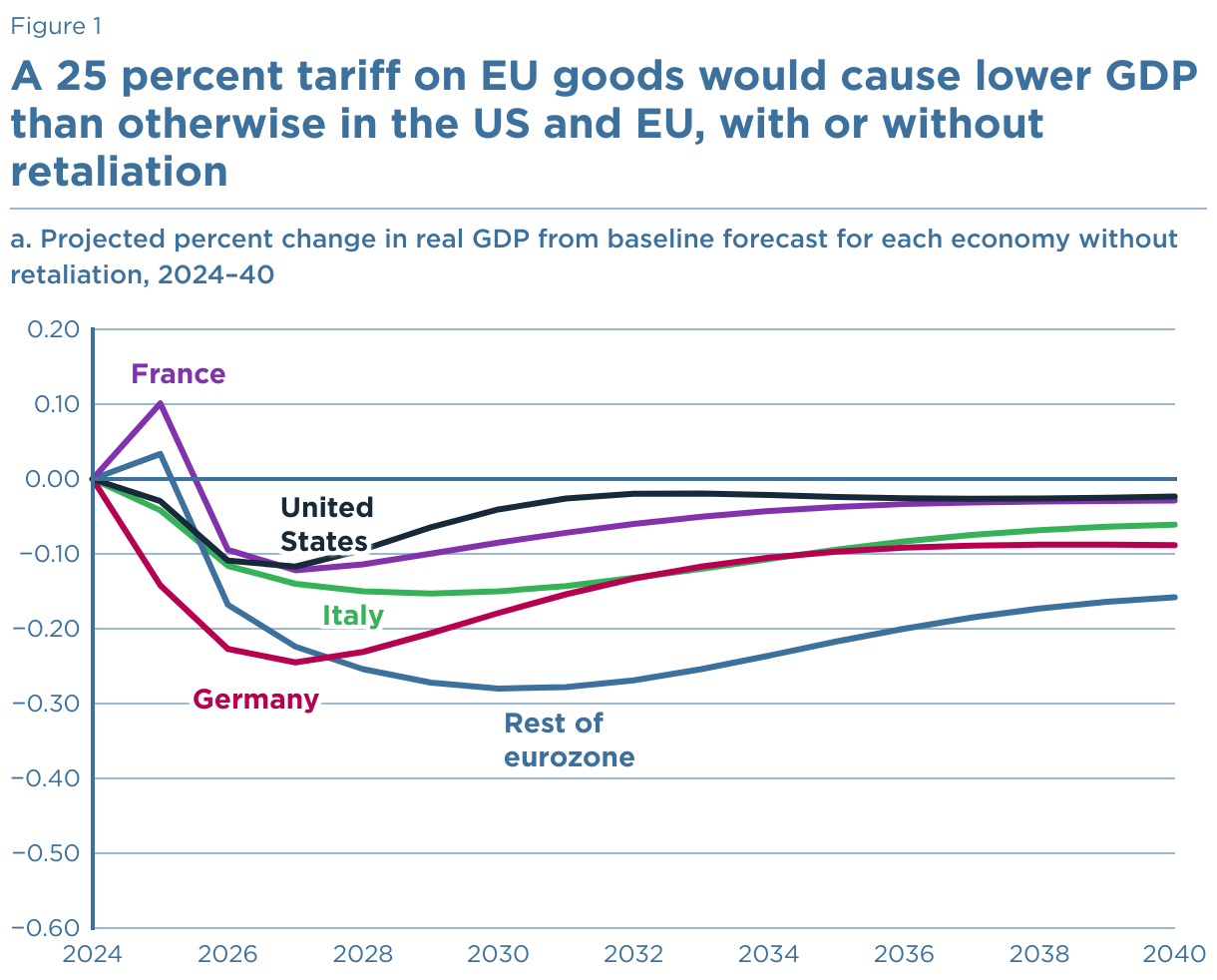 a. Projected percent change in real GDP from baseline forecast for each economy without retaliation, 2024–40