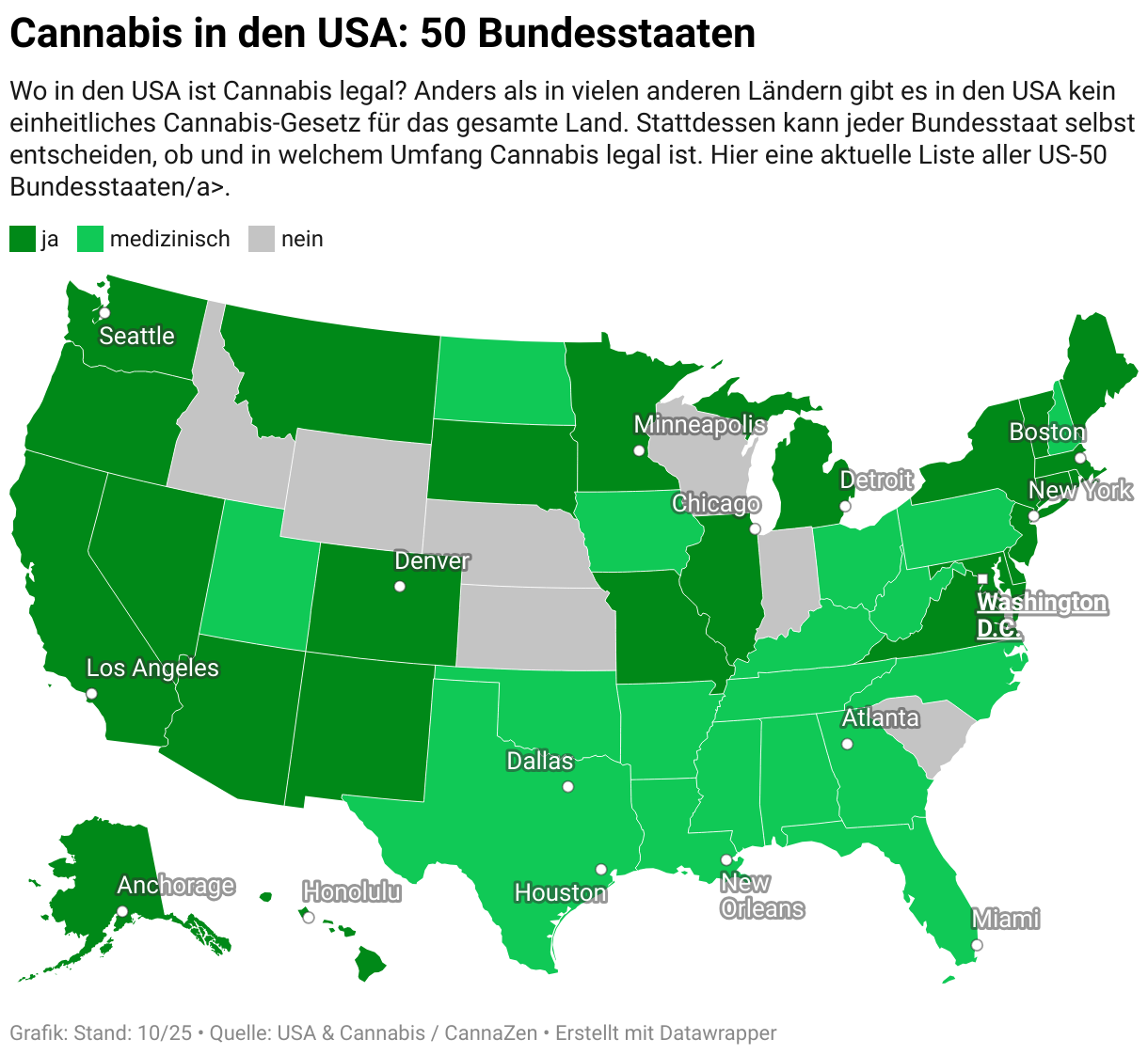 Wo in den USA ist Cannabis legal? Anders als in vielen anderen Ländern gibt es in den USA kein einheitliches Cannabis-Gesetz für das gesamte Land. Stattdessen kann jeder Bundesstaat selbst entscheiden, ob und in welchem Umfang Cannabis legal ist. Hier eine aktuelle Liste aller US-50 Bundesstaaten/a>.
