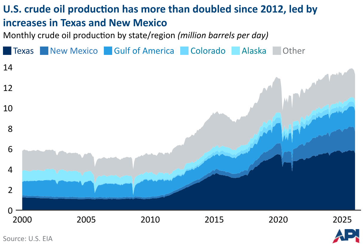 Monthly crude oil production by state/region (million barrels per day)