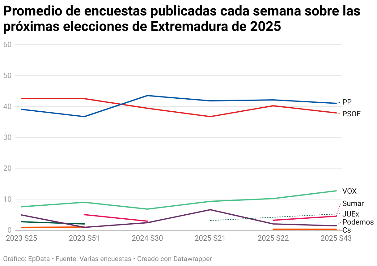 Promedio de encuestas publicadas cada semana sobre las próximas elecciones de Extremadura de 2025