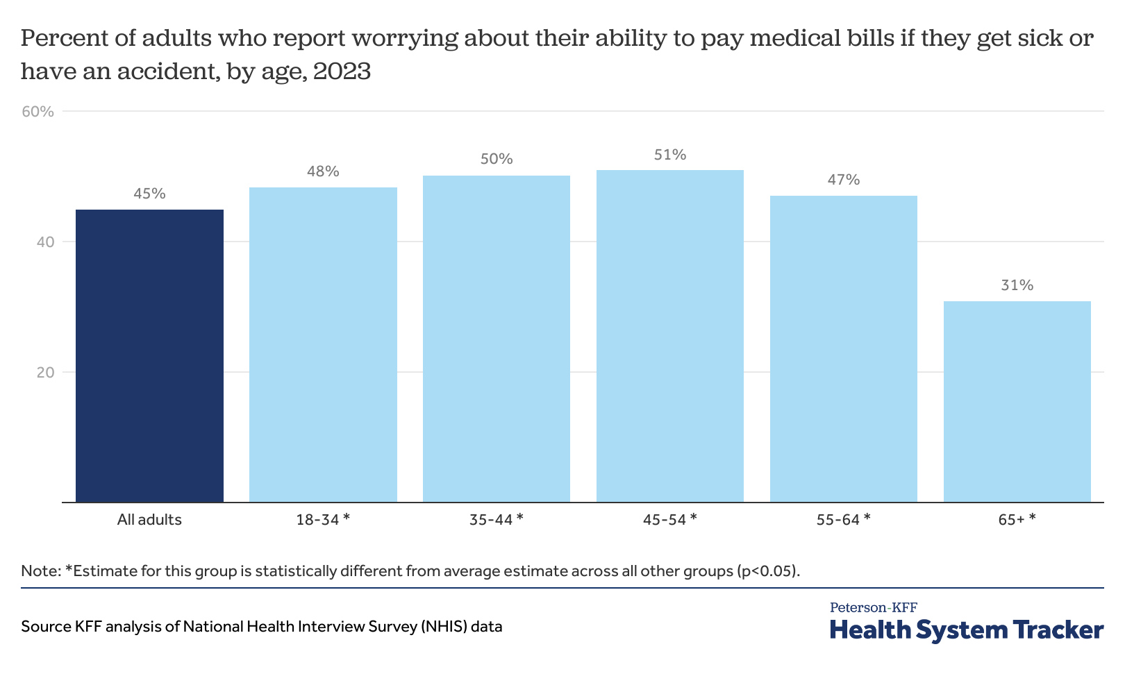 Percent of adults who report worrying about their ability to pay medical bills if they get sick or have an accident, by age, 2023