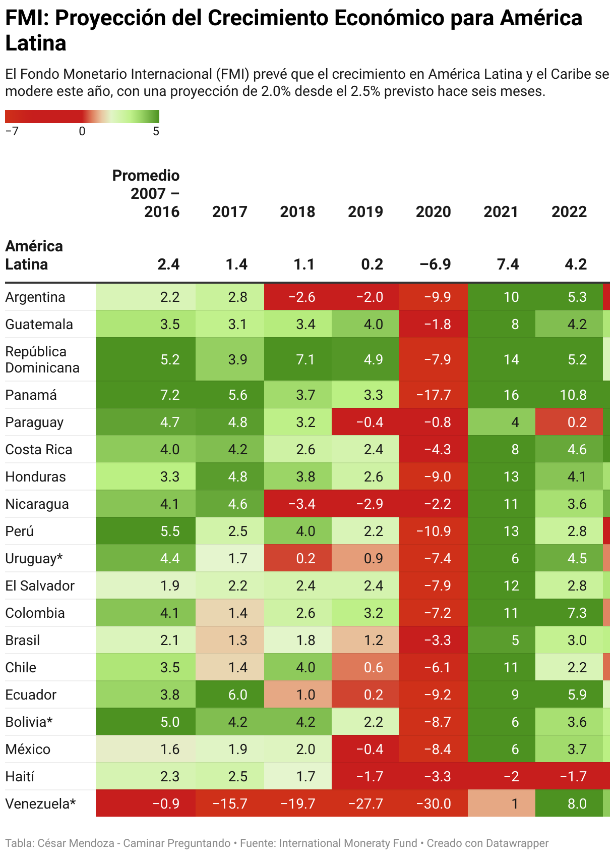 El Fondo Monetario Internacional (FMI) prevé que el crecimiento en América Latina y el Caribe se modere este año, con una proyección de 2.0% desde el 2.5% previsto hace seis meses.